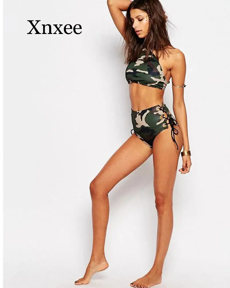 Камуфляжное бикини, купальник с высокой талией, купальник с высокой горловиной, камуфляжный бандажный купальный костюм с перекрестными лямками, женская одежда для купания армейского зеленого цвета, сексуальная