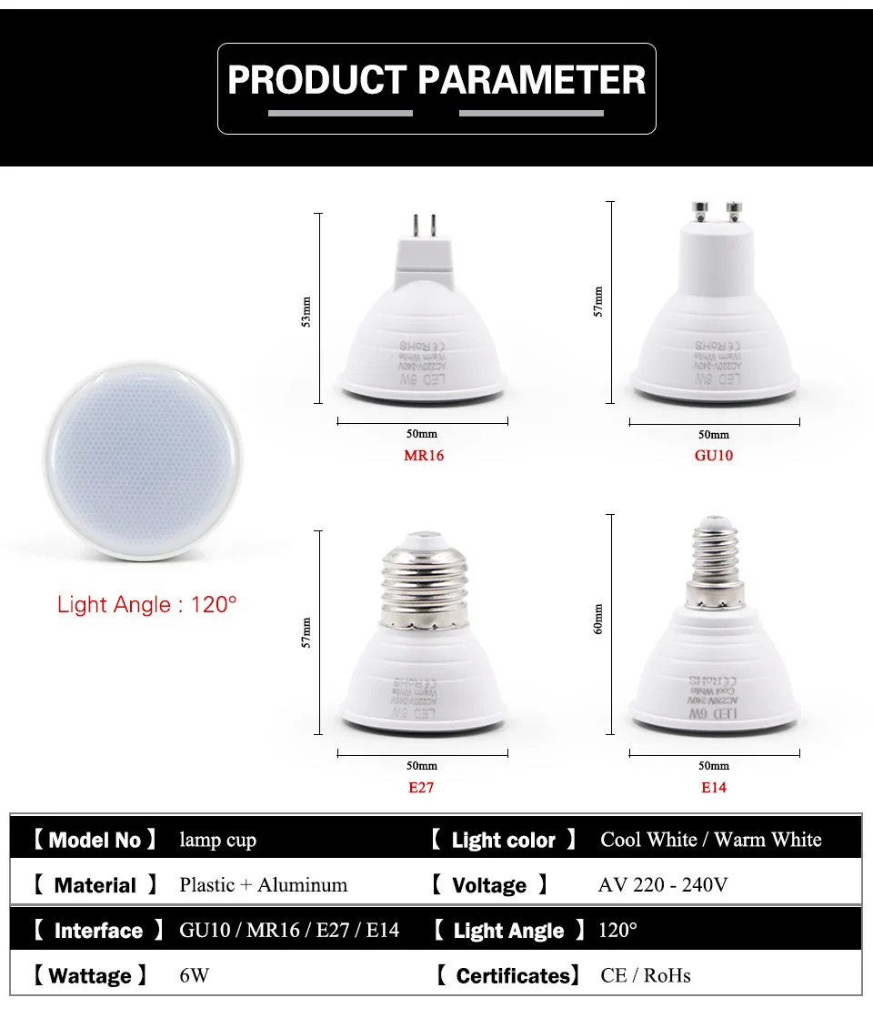 Светодиодный точечный светильник E27 E14 MR16 GU10 GU5.3, светодиодный светильник 6 Вт 220 В-240 В, 24120 градусов, Светодиодный точечный светильник