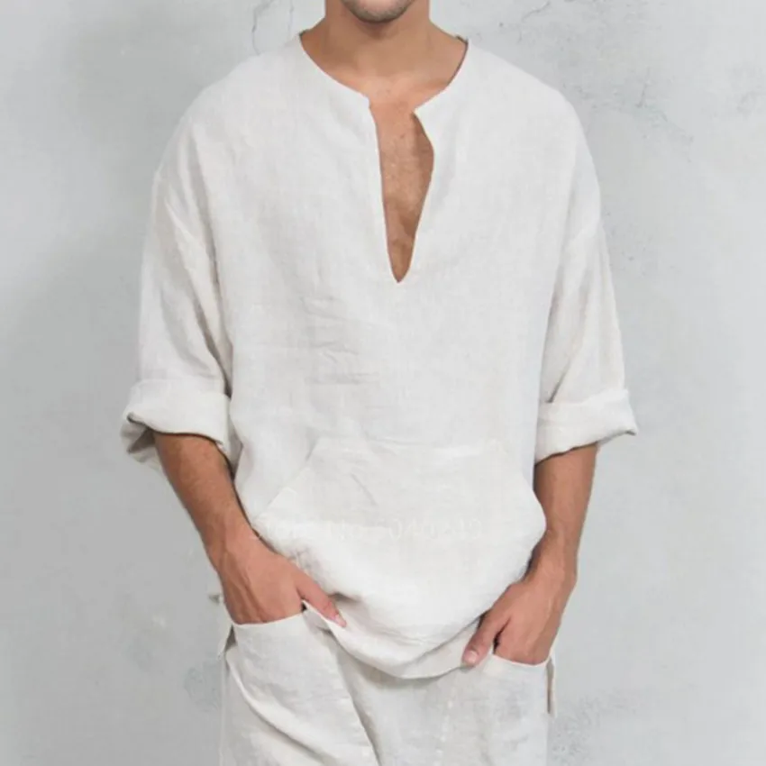 Мужской льняной костюм для косплея, Однотонная рубашка в средневековом стиле с V-образным вырезом, замаскированным карманом, дышащая одежда викингов для Хэллоуина и карнавала