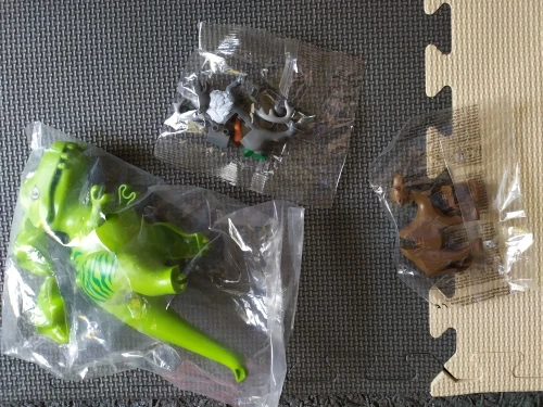 фигурки гораздо меньше, чем ожидала, см 6-7 в длину, нужно собирать как конструктор, т.е. мельче чем Лего Дупло. упаковано хорошо, пришло быстро.