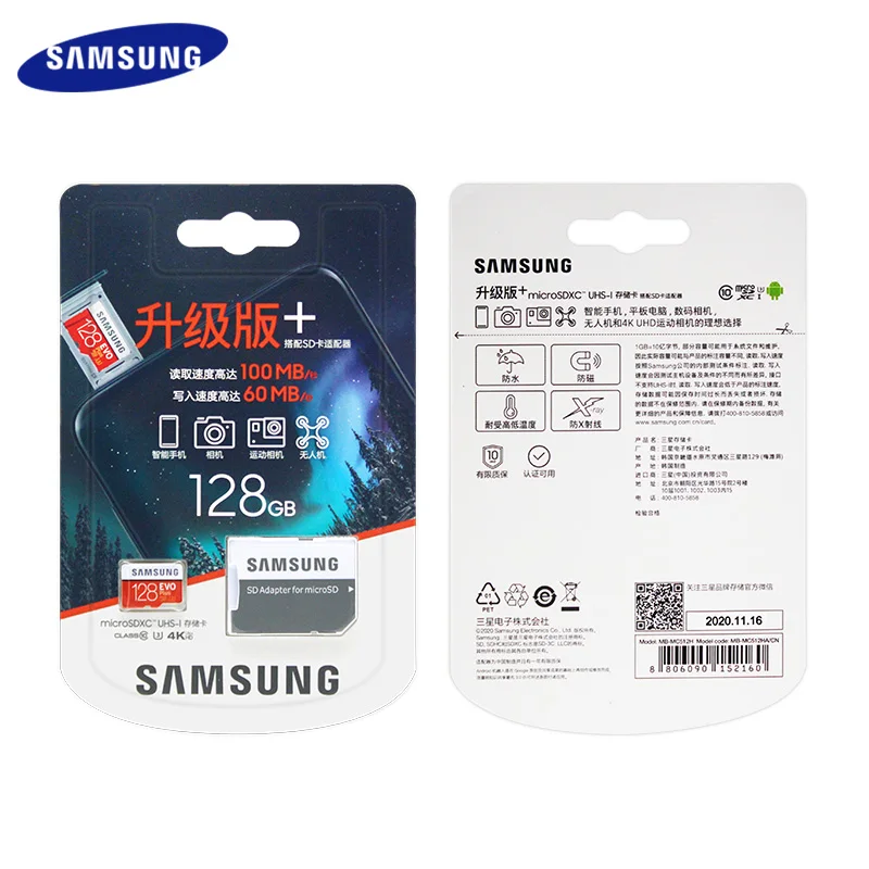 Карта памяти Micro SD SAMSUNG EVO Plus, 128 ГБ, SDXC C10 U3, TF карта с адаптером, флеш-карта для телефонакамерыдрона