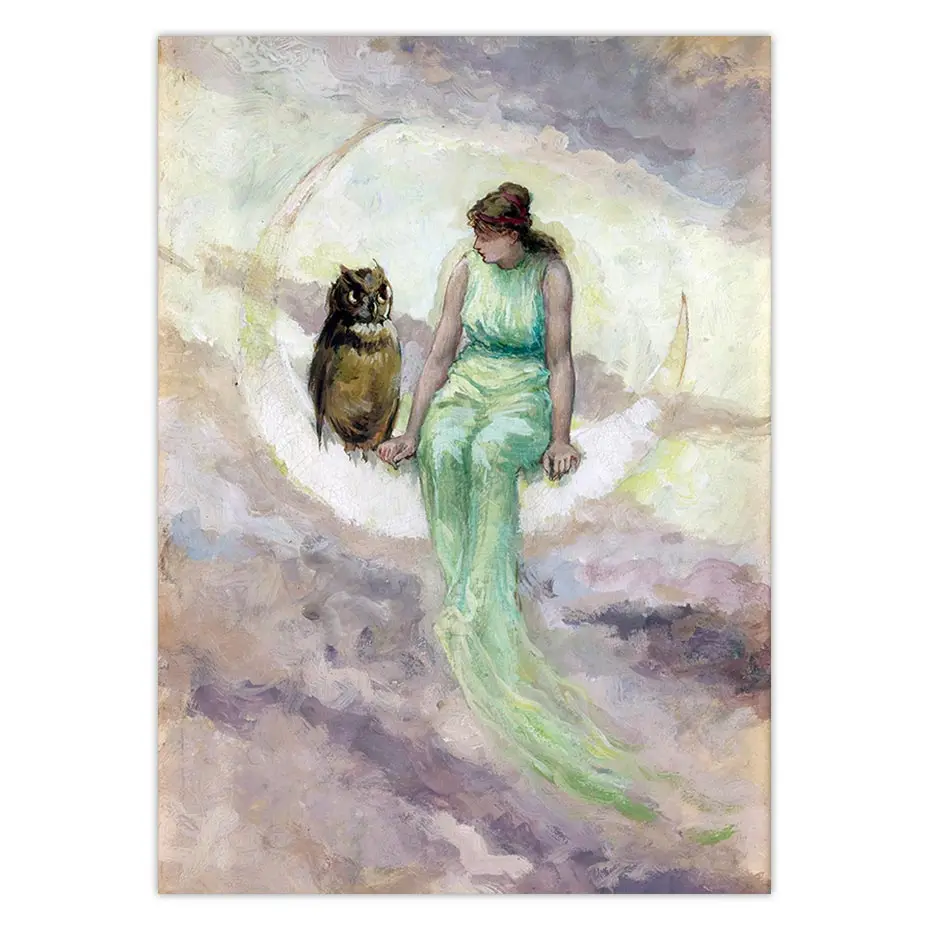 Винтажный постер с изображением ведьмы дочери Луны богини на холсте женщина на Полумесяце Сова Античная сказка Настенная картина