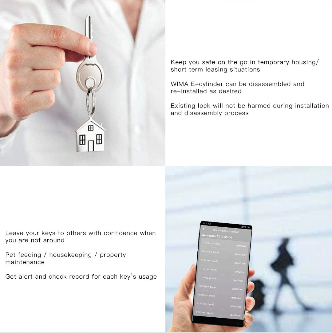 Этот замок является интеллектуальным электронным замком, ключи встроены в смарт-чип. Он сохранит ваш дом в безопасности. Вам нужно использовать электронный ключ для блокировки/разблокировки. Вы не можете управлять блокировкой с помощью приложения для телефона, но вы можете управлять ключами и проверять запись блокировки с помощью приложения. Вы также можете добавить блокировку в ваш умный дом с помощью приложения.