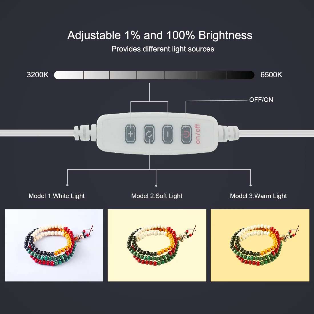 Поставляется с кольцом светодиодный светильник Панель (С переключателем температуры трех цветов) Обеспечивает различную яркость и предотвращает появление теней и отражений на фотографиях.