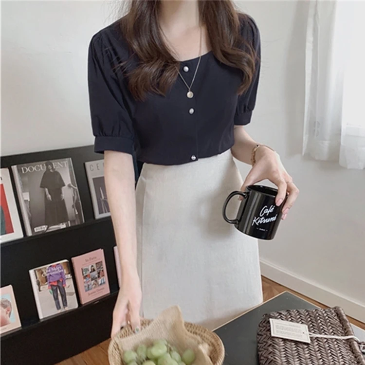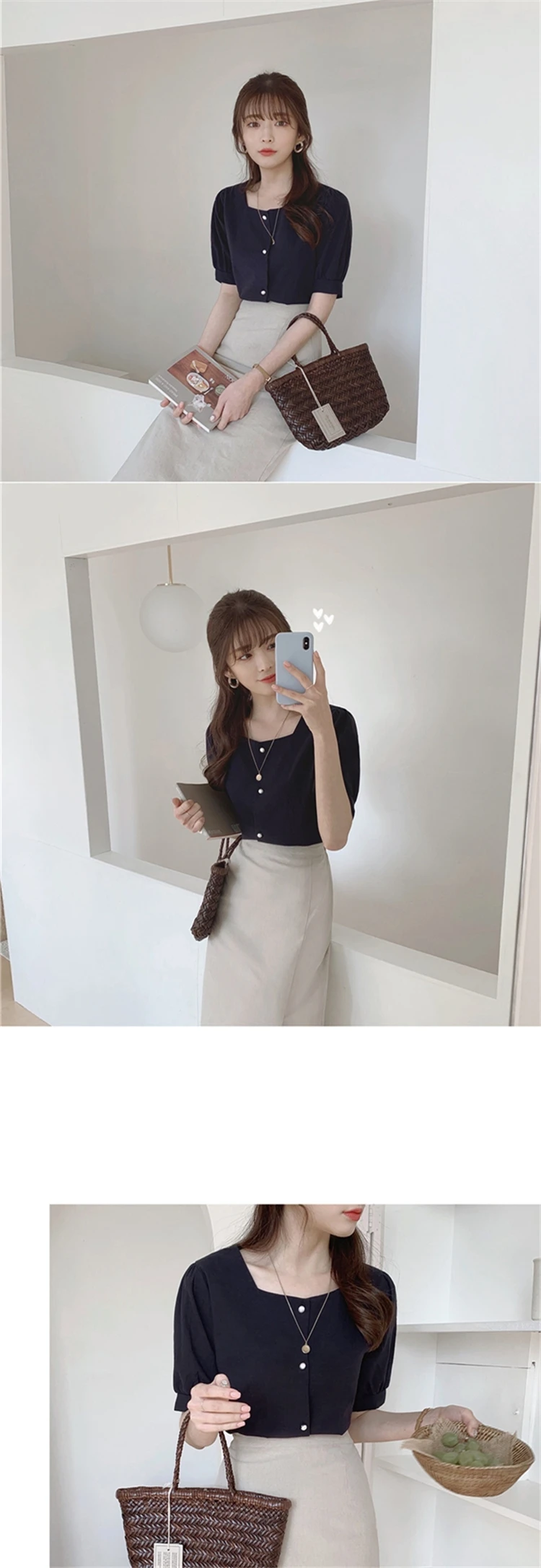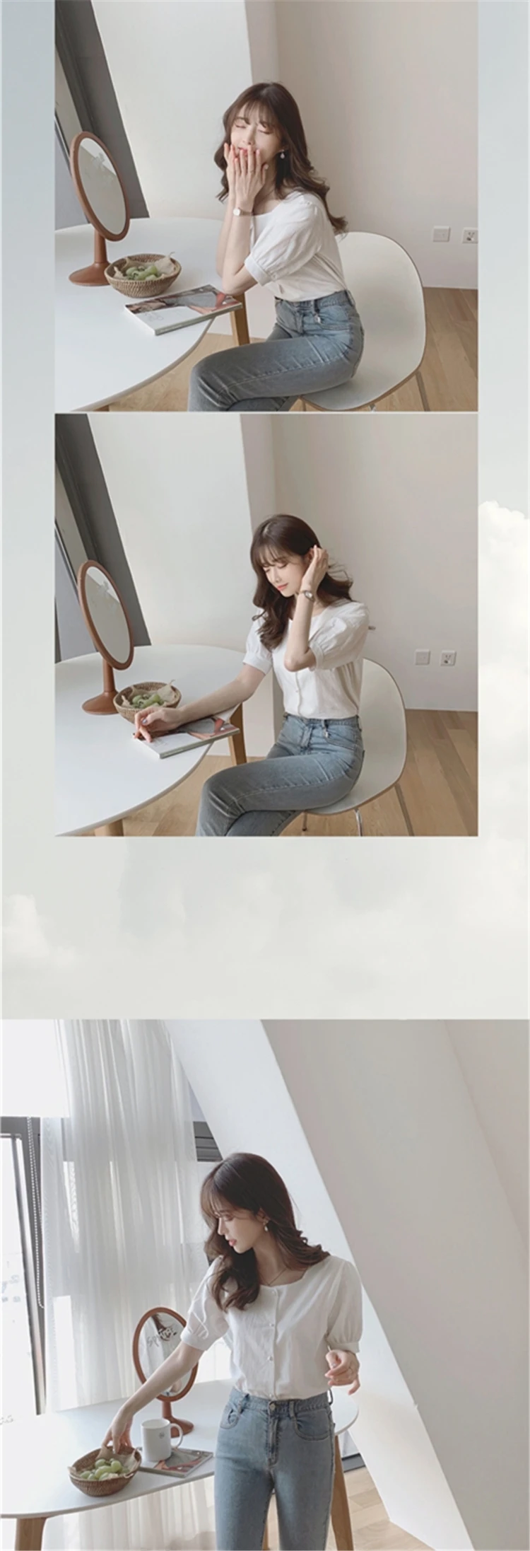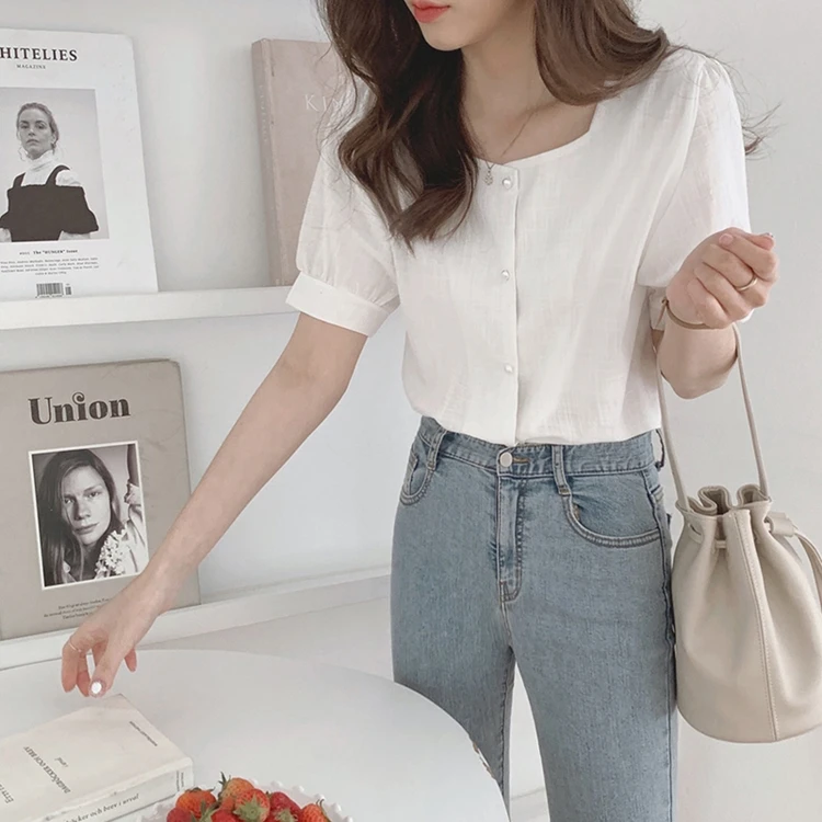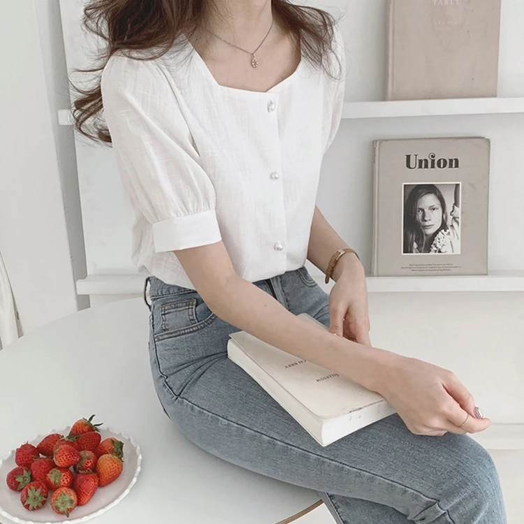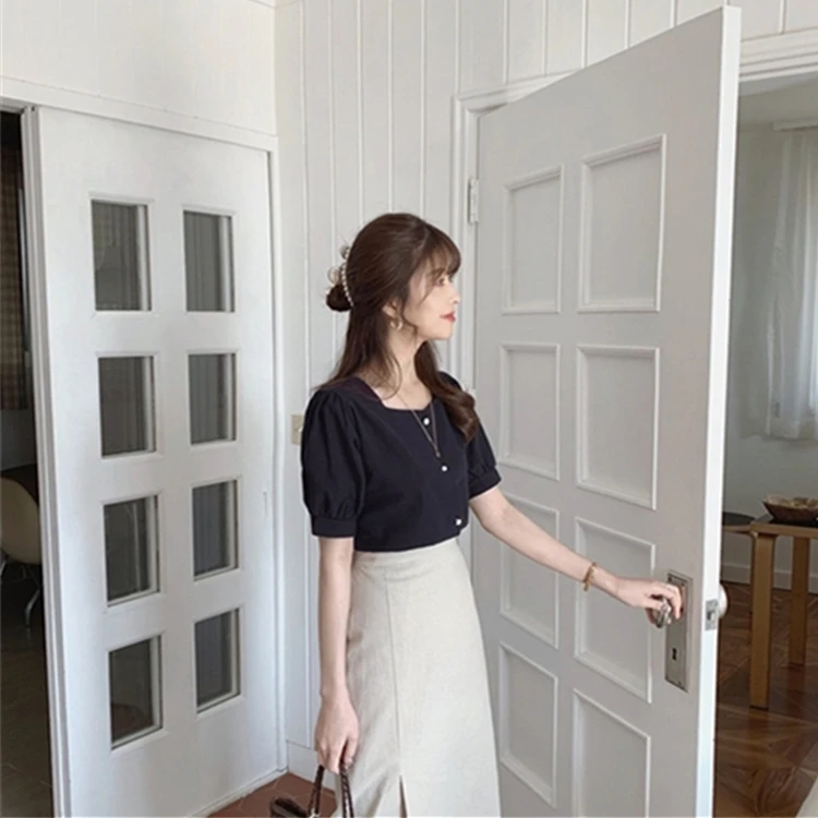 Блузка женская однобортная, с квадратным вырезом и пышными рукавами, лето 2021