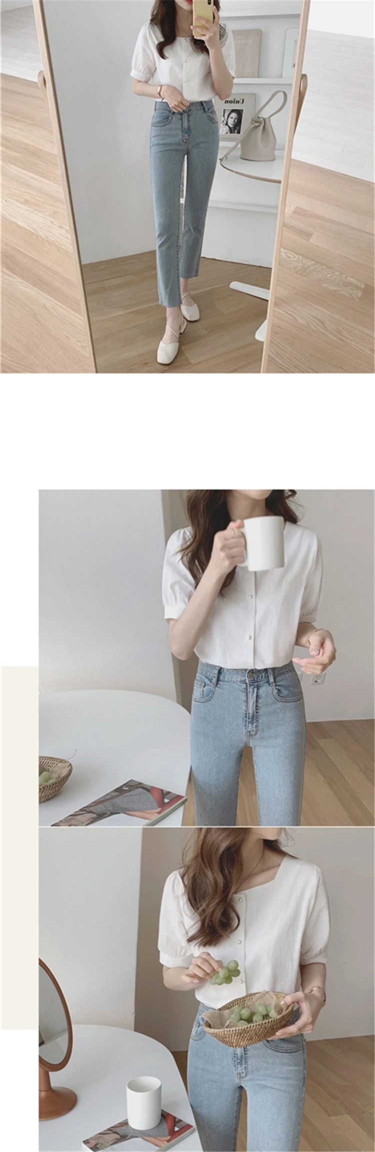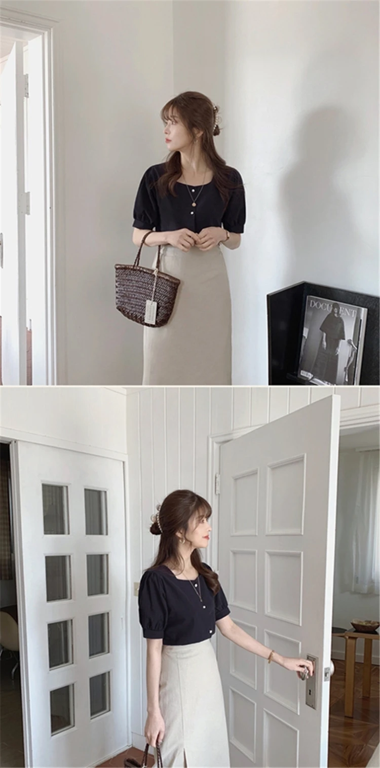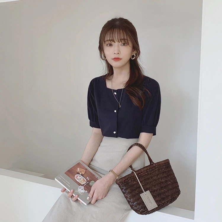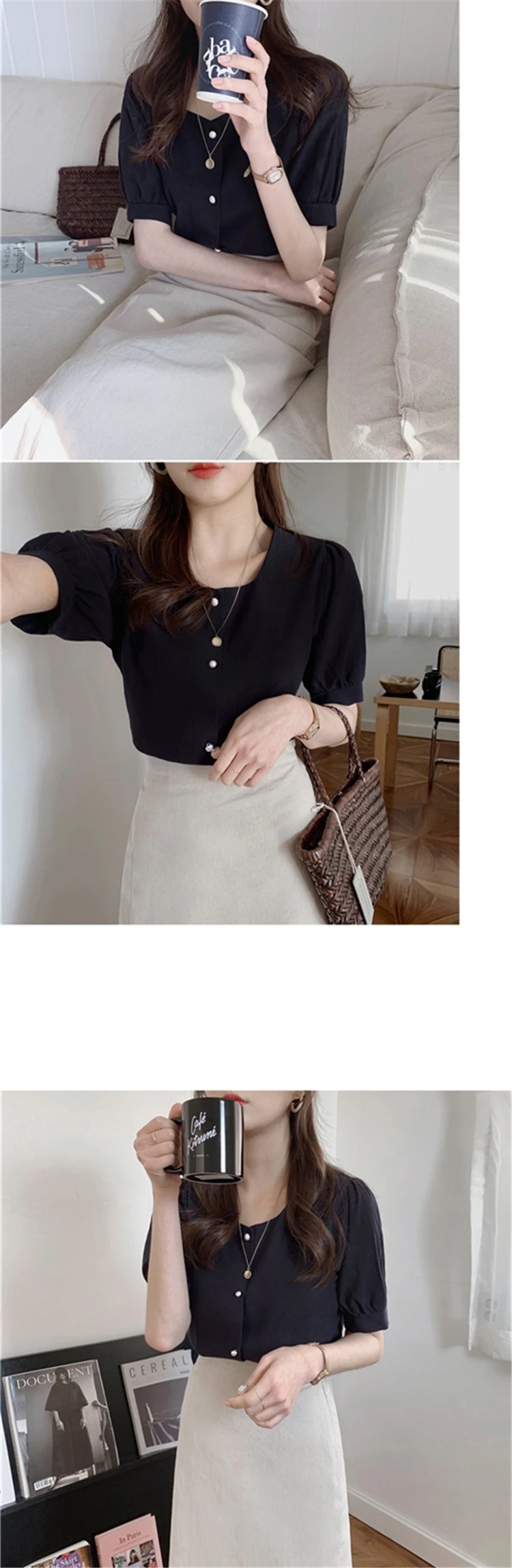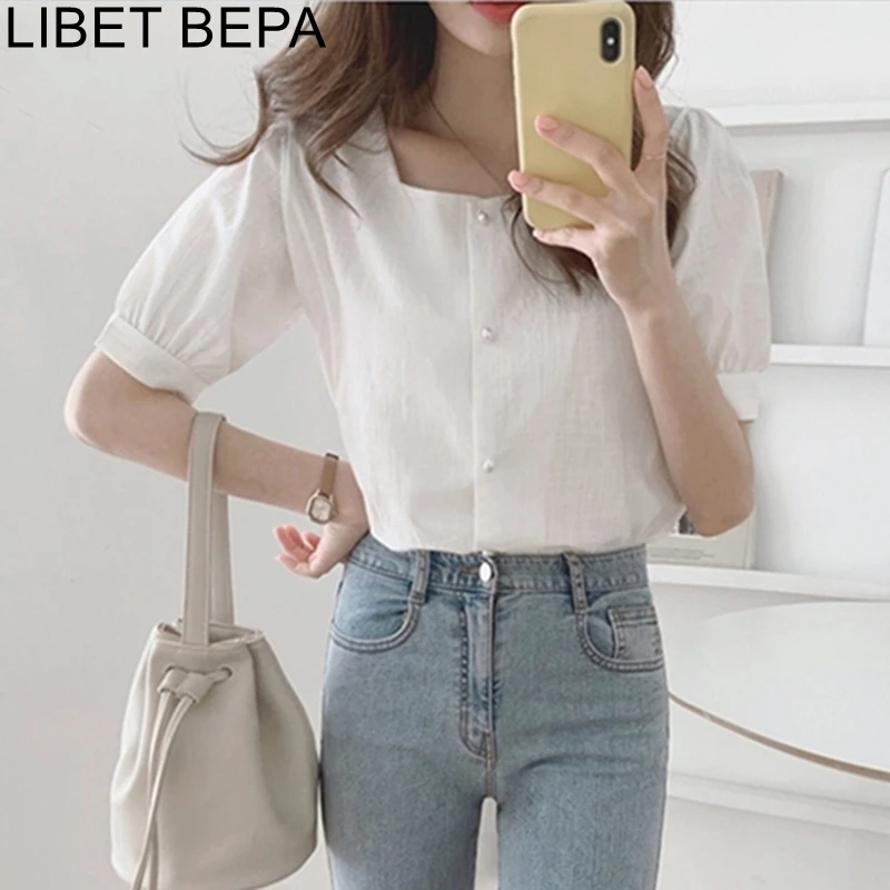 Блузка женская однобортная, с квадратным вырезом и пышными рукавами, лето 2021