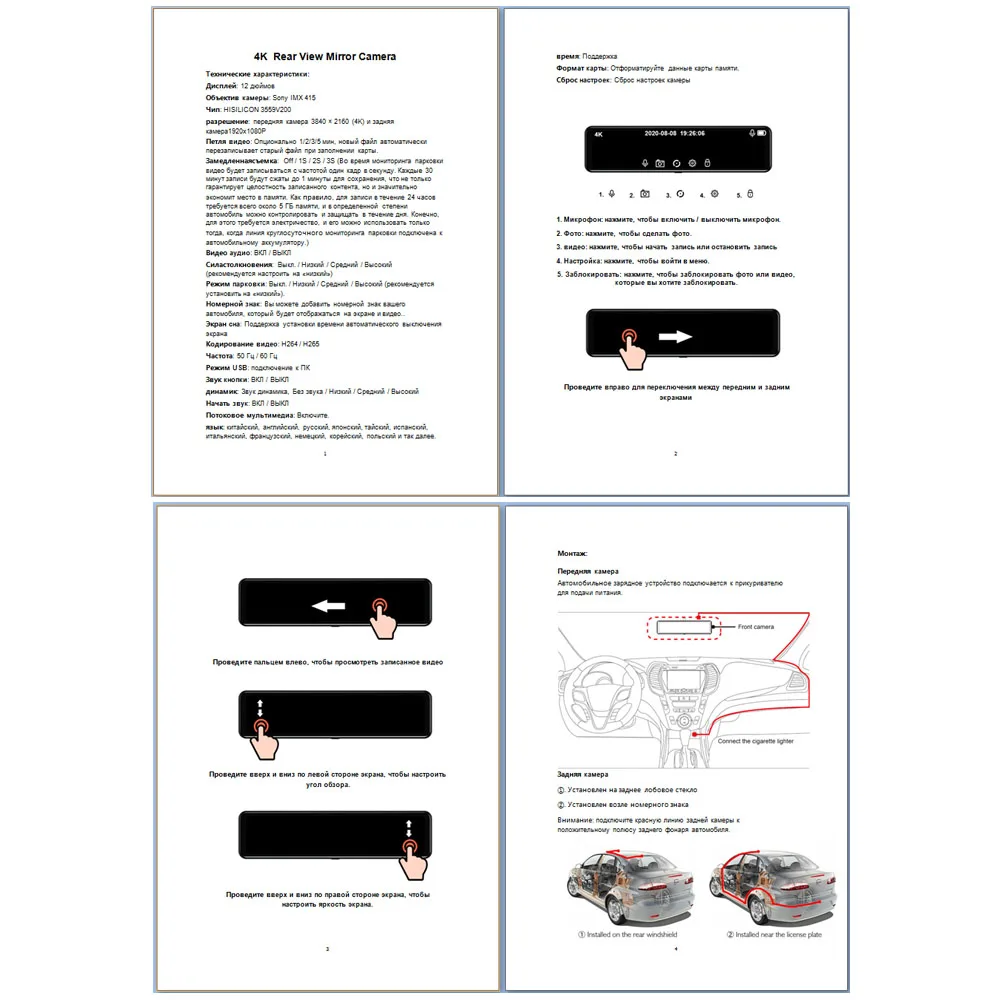 Модель: D255Дисплей: 12 дюймовКарта памяти: TF-карта класса 10 (8-64 Гб)Разрешение видео: 3840 × 2160(4K) и 1920x1080PКодирование видео: H264/ H265Объектив камеры: Sony IMX 415Замедленная съемка: Выкл./1 с/2 с/3 сПарковочный кожух: Выкл./низкий/средний/высокийЗаставка: поддержка установки времени, когда экран автоматически выключаетсяЧастота: 50 Гц/60 ГцЗвук клавиши: вкл/выклЗвук загрузки: вкл/выклЗвук динамика: бесшумный/низкий/средний/высокийG-сенсор: Выкл./низкий/средний/высокий3 варианта чувствительности объектива: 8 м пикселей, 170 градусов HD широкоугольный бесшовное видео: без прерывания видеоЦиклическое видео: Дополнительно 1/2/3/5 мин, новый файл автоматически перезаписывает старый файл при заполнении карты.Диафрагма: F2.0Звук кнопки: включение/выключениеДата/время: Поддержка2 разделенных дисплея одновременно: ПоддержкаАккумулятор: встроенный литий-полимерный аккумуляторПитание USB для автомобиля: 5 ВРабочая температура: от-20 ℃ до 70 ℃Температура хранения: от-30 ℃ до 80 ℃Тип установки: зеркальная камера заднего видаСрочный режим видео: поддержка блокировки аварийного видео.Воспроизведение видео на зеркале: переднее срочное видео, переднее обычное видео, заднее обычное видео, заднее срочное видеоВоспроизведение фотографий на зеркале: переднее фото/заднее фото. Применение: камера 4K, потоковый мультимедийный вид заднего вида, отличное ночное видение, реверсивное видео, 24-часовой парковочный монитор, датчик столкновения, двойное переднее и заднее видео, циклическая запись, регулируемый угол обзора, специальный Монтажный держатель
