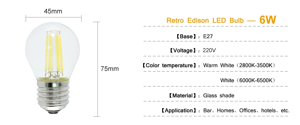 Название: светодиодный светильник в стиле ретро тип цоколя лампы: E27 Модель: G45 мощность: 2 Вт/4 Вт/6 Вт светодиодный объем: 2 шт./4 шт./6 шт. Цветовая температура: теплый белый 2700-3200K; Холодный белый: 6000-6500K люменов: 100 лм/Вт Напряжение: 220 В CRI: 90Ra (подходит для оконного дисплея и украшения пятизвездочного отеля) красный, зеленый, синий) Угол пучка: Рабочая температура на 360 °: от-20 до + 40 °, Рабочая влажность: 20%-85% RH, без конденсации, температура: от-20 ° до + 70 °, Влажность хранения: 10%-95% RH Материал: Стекло averange срок службы:> 80000 часов Гарантия: 3 года Сертификат: по ограничению на использование опасных материалов в производстве & CE