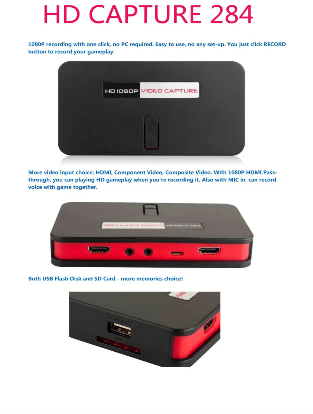 HD Запись для игр EZcap 284 1080P AVYpbpr, записывающее устройство для видеозахвата в USB диске, sd-карта для Xbox360One PS34 US Plug