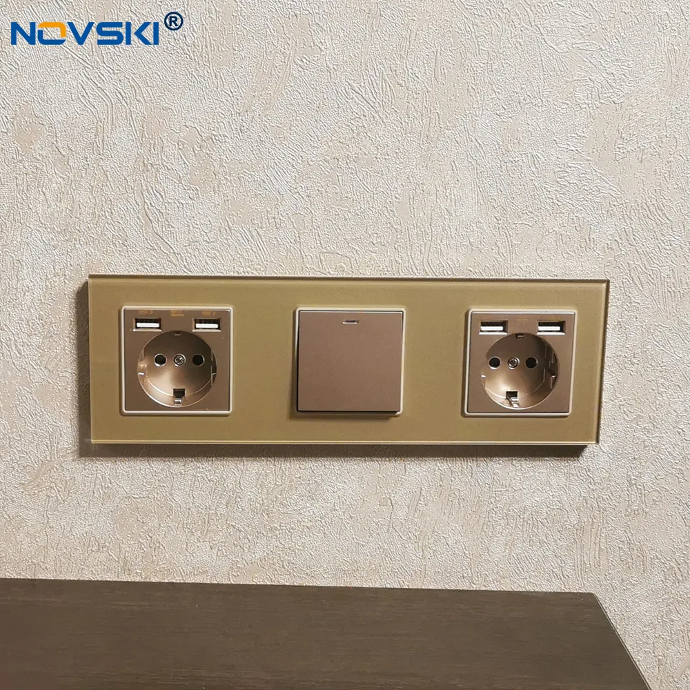 Немецкая настенная розетка NOVSKI USB, 1-клавишный выключатель светодиодный подсветкой, тройная электрическая розетка 16 А, серый Заземленный