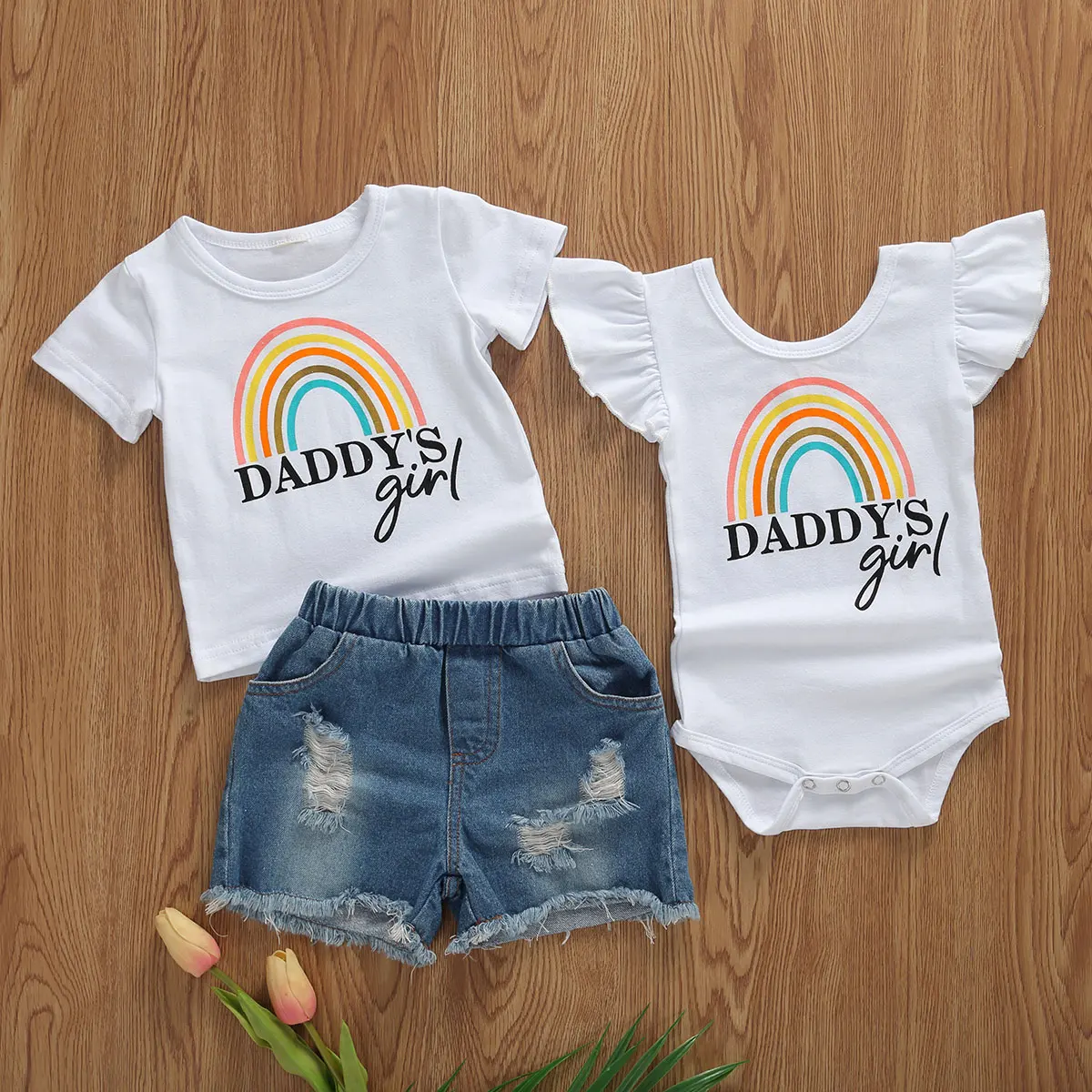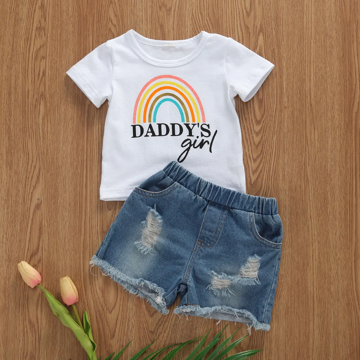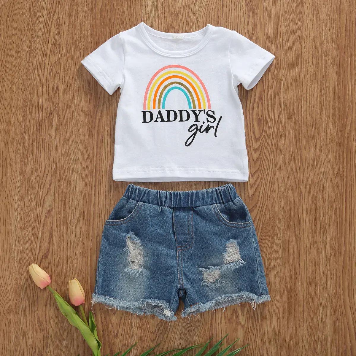 От 0 до 6 лет летнее платье прекрасный ребенок младенец девочки Комплекты одеждыкомбинезон с радужным принтом, топы + джинсовые шорты