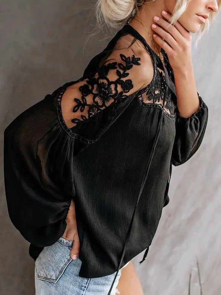 Женская шифоновая блузка, повседневная черная Свободная блузка с длинным рукавом и V-образным вырезом, винтажная модель Блуза женская рубашка, блузки в богемном стиле