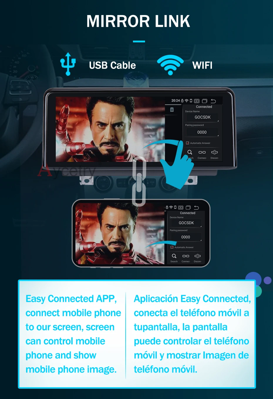 Подключите ваш мобильный телефон к этому радио с помощью функции зеркальной связи, радиоэкран покажет мобильный телефон, как зеркало. И радио может управлять ваш мобильный телефон, так что вы можете слушать мобильный телефон музыку или совершать звонки через Радио экран после их подключения.