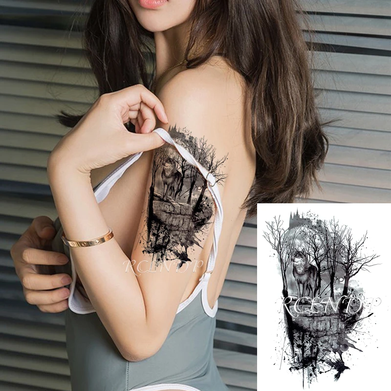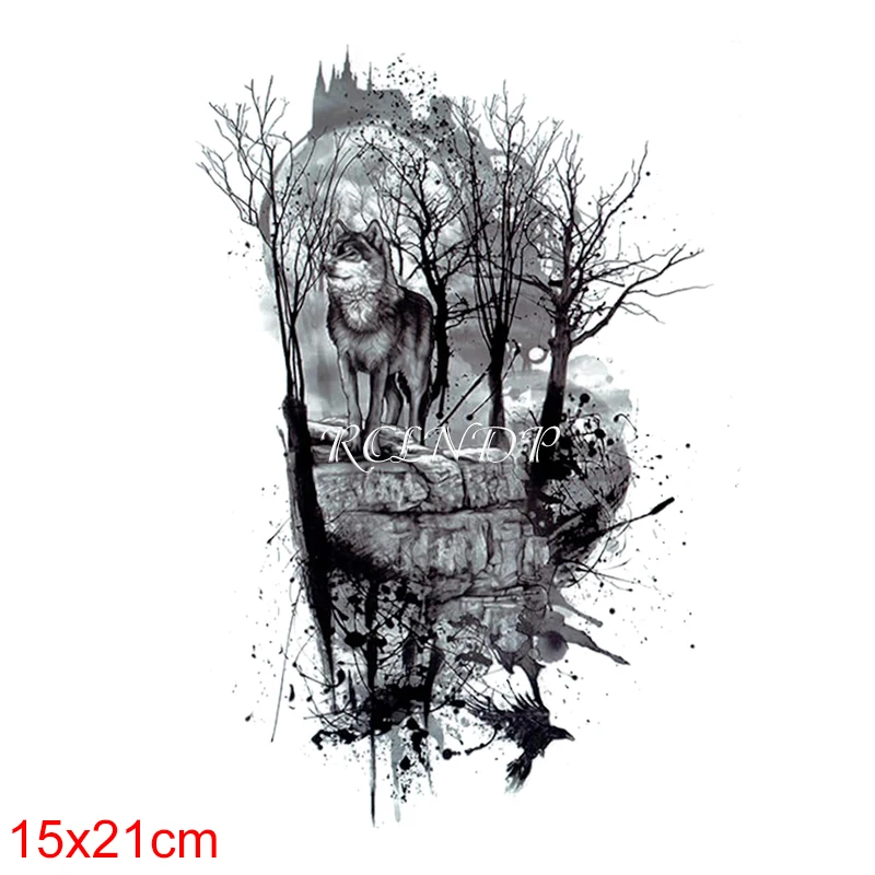 Водостойкая Временная тату-наклейка Волчья ворона птица Лес Дерево черная поддельная тату флэш-тату рука ноги большой арт для женщин мужчин девушек