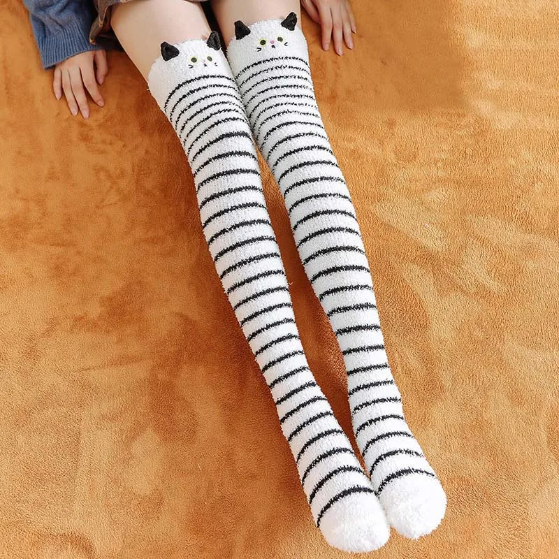 Зимние теплые женские гольфы из кораллового флиса, Чулки с животными из мультфильмов, милые гольфы в полоску для девочек