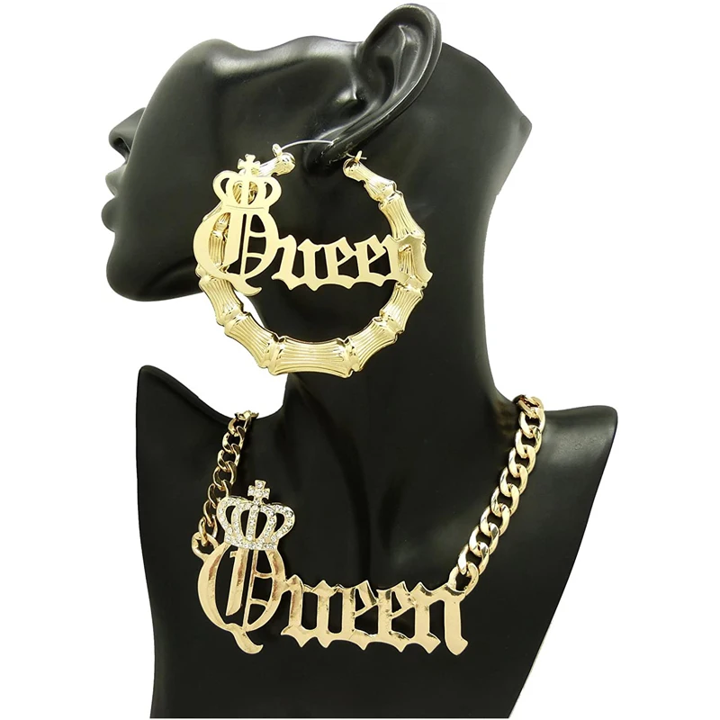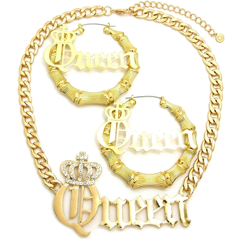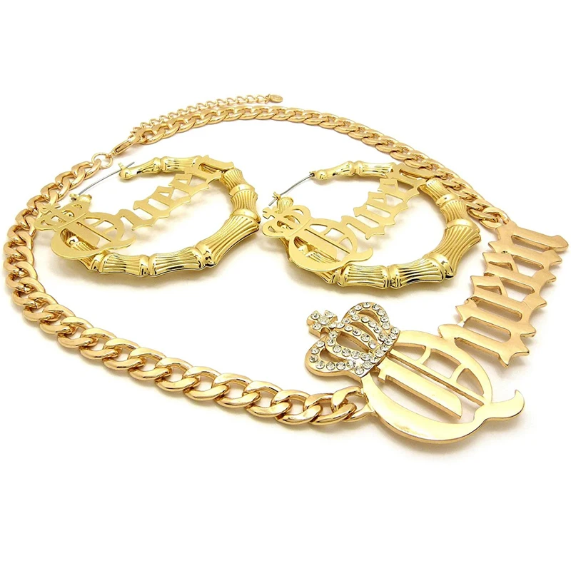 Модное женское настраиваемое имя королевы Ожерелье Сексуальные бамбуковые проколотые серьги в золоте ToneCustomize имя для женщин подарок