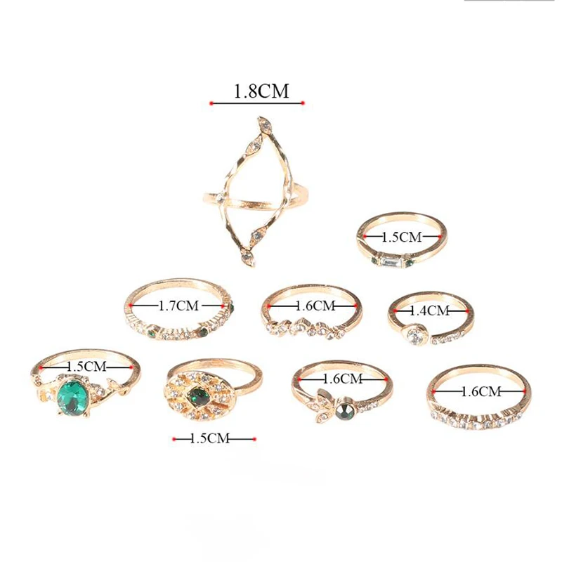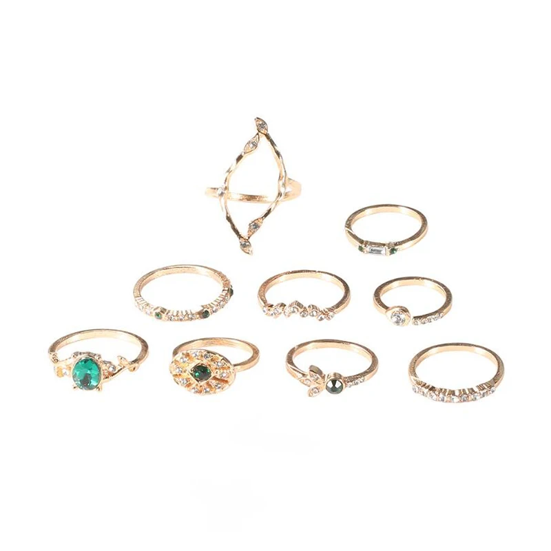 Женский комплект колец на концах пальца, 9 шт.компл., в богемном стиле, с зелеными кристаллами