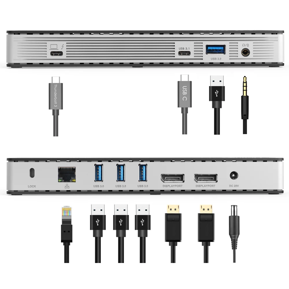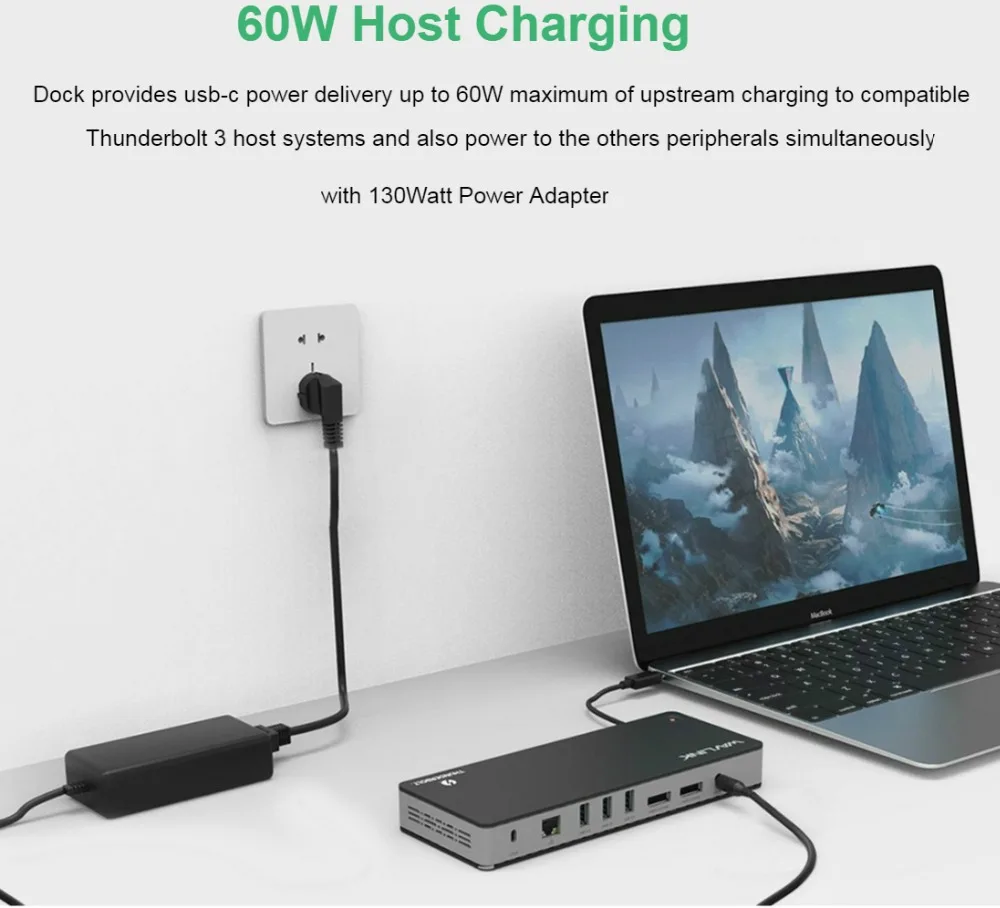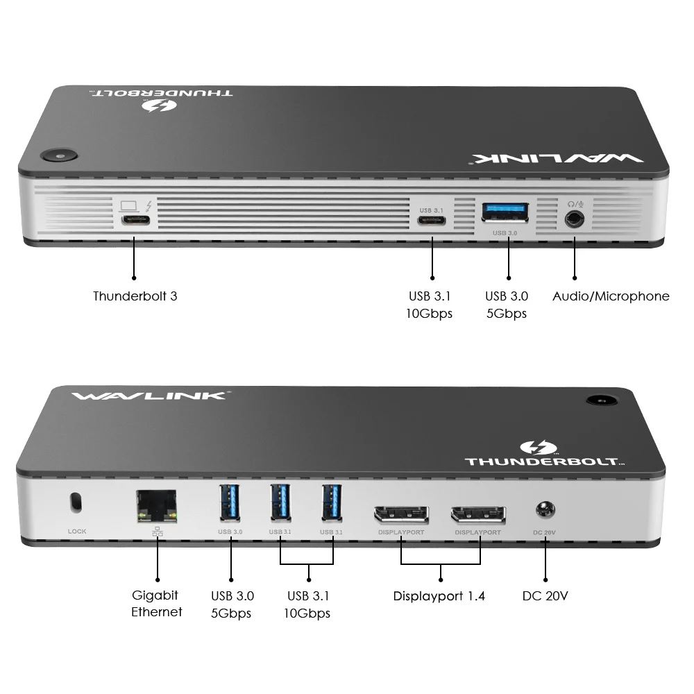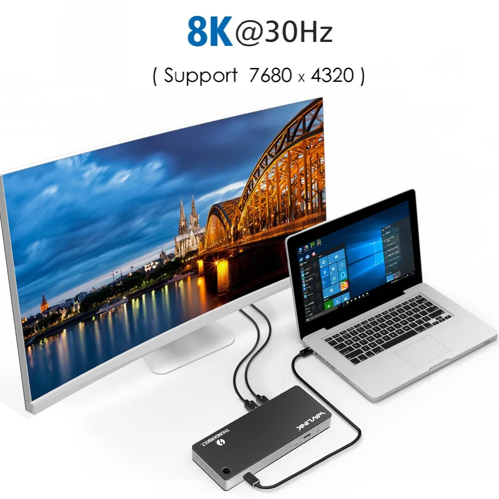 Док-станция WAVLINK Thunderbolt 3 USB-C 8K с зарядкой до 60 Вт, двойным дисплеем 4k, двойным дисплеем 1,4, 3xUSB Gen 2, 2xUSB3.0, гигабитный Ethernet, аудио для MacBook Pro и конкретных ПКОписание продукта:Док-станция Thunderbolt 3 Titan USB-C обеспечивает мощность до 60 Вт с возможностью подключения двух дисплеев 4K @ 60 Гц. USB-C компьютер с совместимостью портов USB3.1 Gen.2. Док-станция подключается к компьютеру Windows или Mac OS X с помощью одного кабеля Thunderbolt 3 (USB-C), позволяющего подключать до пяти устройств Thunderbolt к одному выходу Thunderbolt. Всего шесть нисходящих портов USB для расширения подключения к устройствам USB, включая один порт USB-C и два порта USB-A, работающих на макс. 10 Гбит/с, два порта USB-A на макс. 5 Гбит/с. В особенности добавление порта Gigabit Ethernet и 3,5 мм стерео-аудиовыхода.Характеристики продукта:* ( 1) технология Thunderbolt 3 второго поколения с помощью JHL7440Чипсет Titan Ridge solution.* ( 2) один кабель Thunderbolt 3 позволяет подключать к компьютеру Windows или Mac OS X несколько данных, видеоустройств и зарядку восходящего ПК. Совместимость с портами USB3.1 Gen.2 для компьютера USB-C.* ( 3) Поддержка USB-C мощности до 60 ватт мощности, что позволяет заряжать аккумулятор вашего ноутбука во время использования.* ( 4) два порта дисплея поддерживают разрешение DP1.4 до4096 × 2160 @ 60 Гц* ( 5) Поддержка дисплея для HBR3 (8,1 ГГц) Обратная совместимость с HBR2 (5,4 ГГц) и HBR (2,7 ГГц)* ( 6) один порт USB-C и два порта USB-A поддерживают скорость передачи данных USB3.1 до 10 Гбит/с* ( 7) два нисходящих порта USB-A поддерживают скорость передачи данных USB3.0 только до 5 Гбит/с* ( 8 )RJ45 Gigabit Ethernet обеспечивают безопасный, надежный высокоскоростной проводнойСети* ( 9) 4-полюсный телефонный разъем в комплекте с комбинированной аудиогарнитурой, разъемом для микрофона.* ( 10) механический замок безопасности удобен многим пользователям.* ( 11) совместим с Microsoft Windows и Apple Mac OSX.Системные требования:1. Система Windows или Mac OS2. Компьютер с 3 портами Thunderbolt USB-C компьютер с USB3.1 с передачей данных, USB-C мощности и альтернативным режимом видеоНапоминание:1) поддерживает только DP1.4, а не другие версии. При использовании адаптера DP адаптер DP также должен поддерживать DP1.4.2) Этот продукт имеет штепсельную вилку ЕС/США/Великобритании, мы отправим ее вам в соответствии с вашей страной, если у вас есть особые вопросы, пожалуйста, оставьте нам сообщение при оформлении заказа, спасибо.
