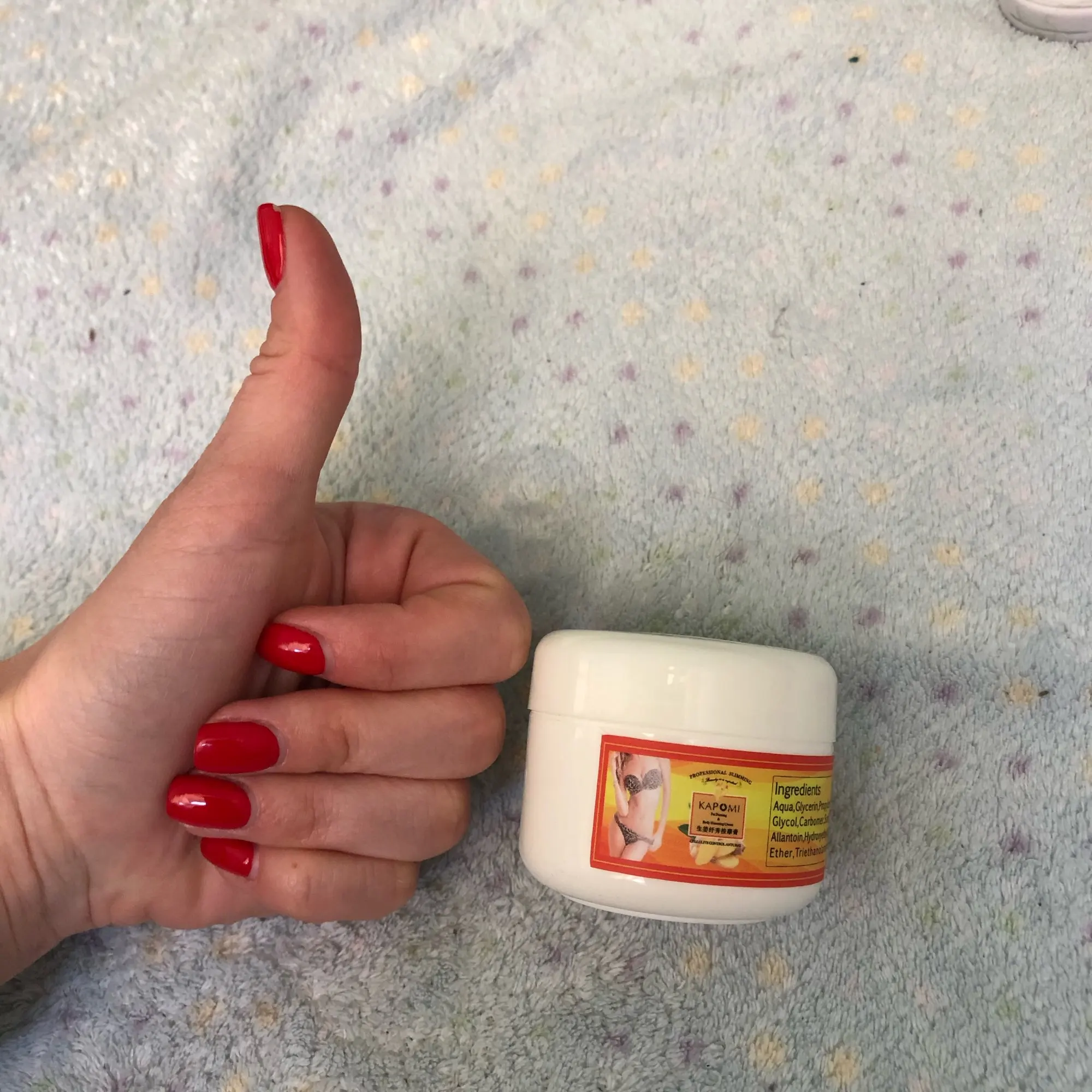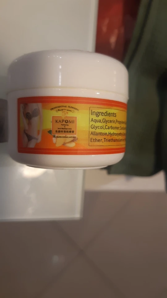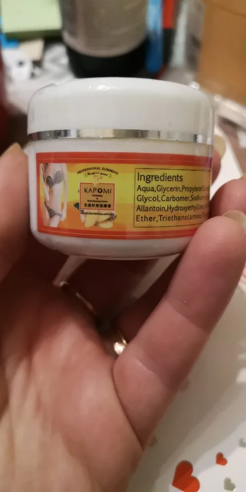 Заказ шел ОЧЕНЬ долго, почти 3 месяца. Баночки очень маленькие, лучше заказывать сразу как минимум 2. Крем при транспортировке протек, несмотря на то, что каждая баночка отдельно упакована в полиэтилен. Уже начала использовать. Если втереть крем активными массажными движениями, то тепло будет довольно интенсивным, но терпеть можно. Единственное, не советую наносить на участки с нежной кожей, и наносить крем лучше в тонких перчатках, чтобы избежать излишнего жжения. На второй подбородок наносить можно))) На мой взгляд эффект от крема есть. Особенно, если его применение сочетать с правильным питанием и физическими упражнениями.