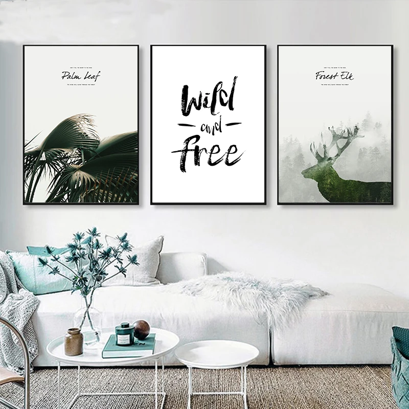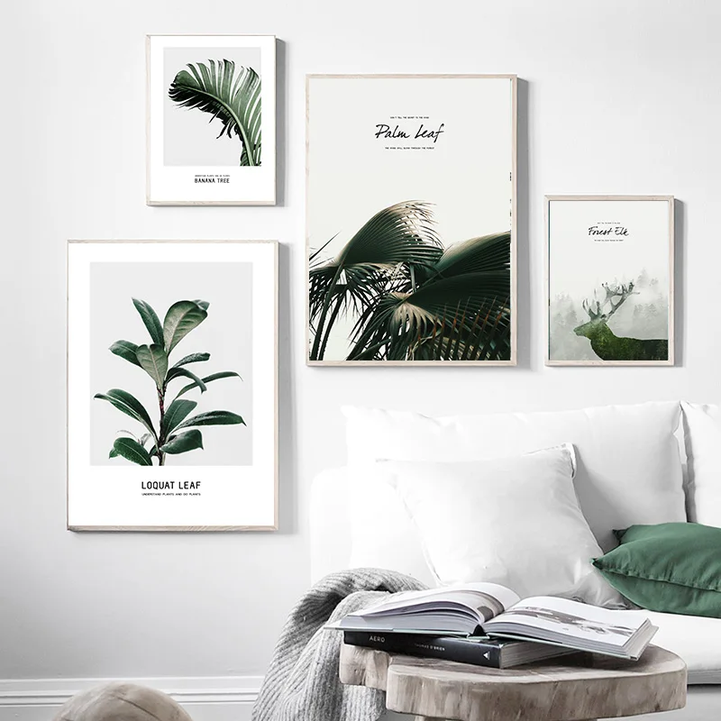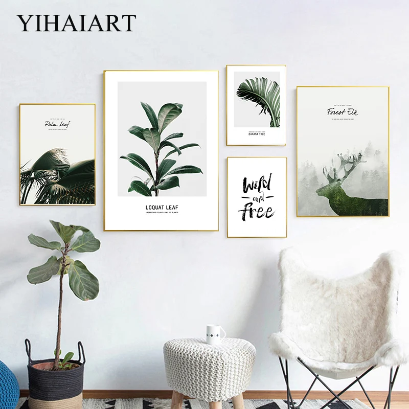 Плакат с изображением зеленых растений, Листьев, скандинавский пейзаж, лесной пейзаж, картина с изображением лося, Современное украшение для гостиной