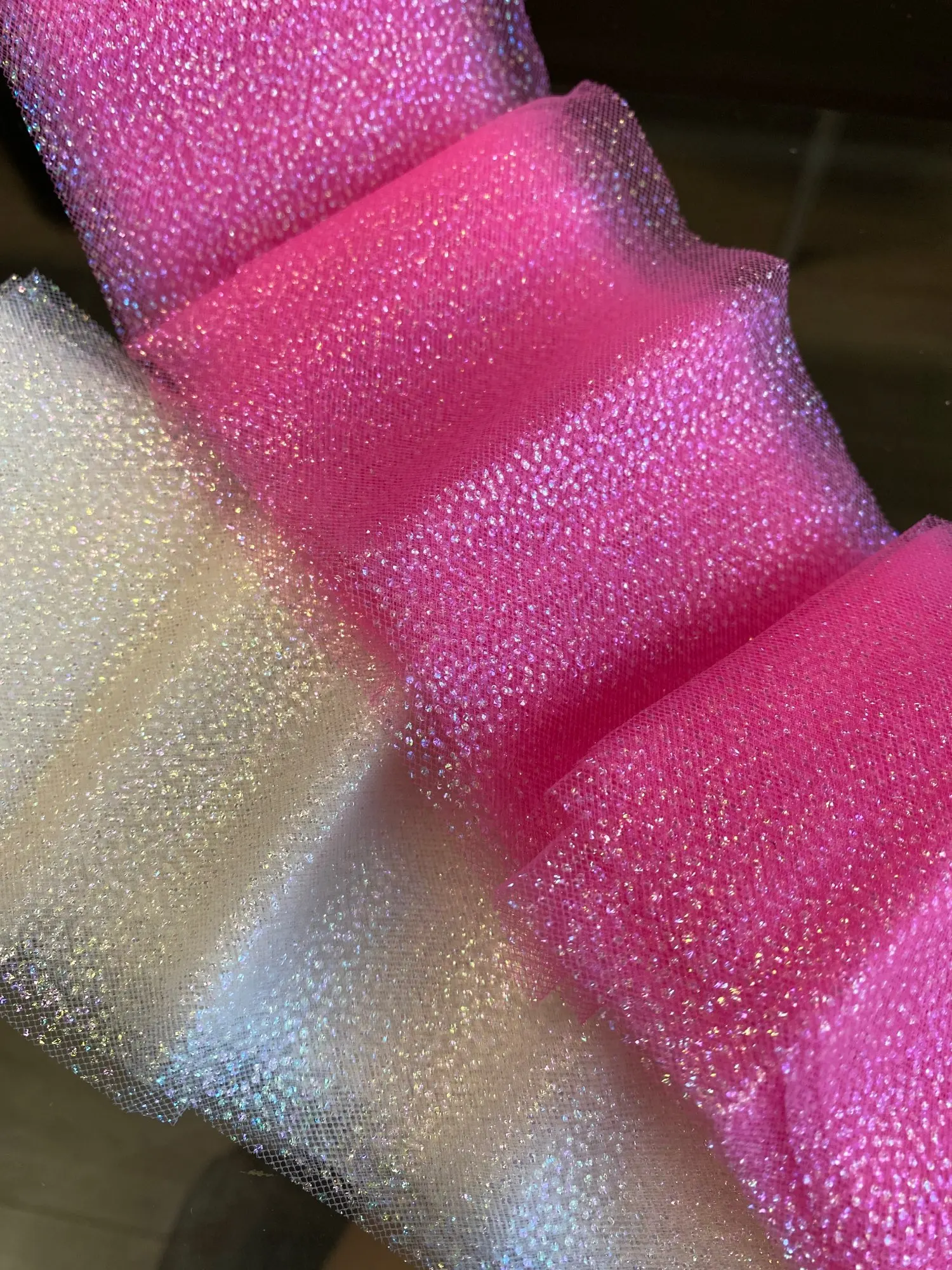 Взяла 5 цветов. Все в соответствии с фото на сайте продавца. Блестки - хамелеоны, не отваливаются. Фатин очень мелкая сетка и мягкая ткань. Очень красиво.