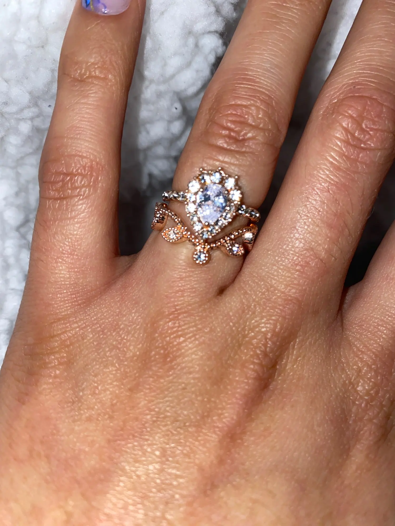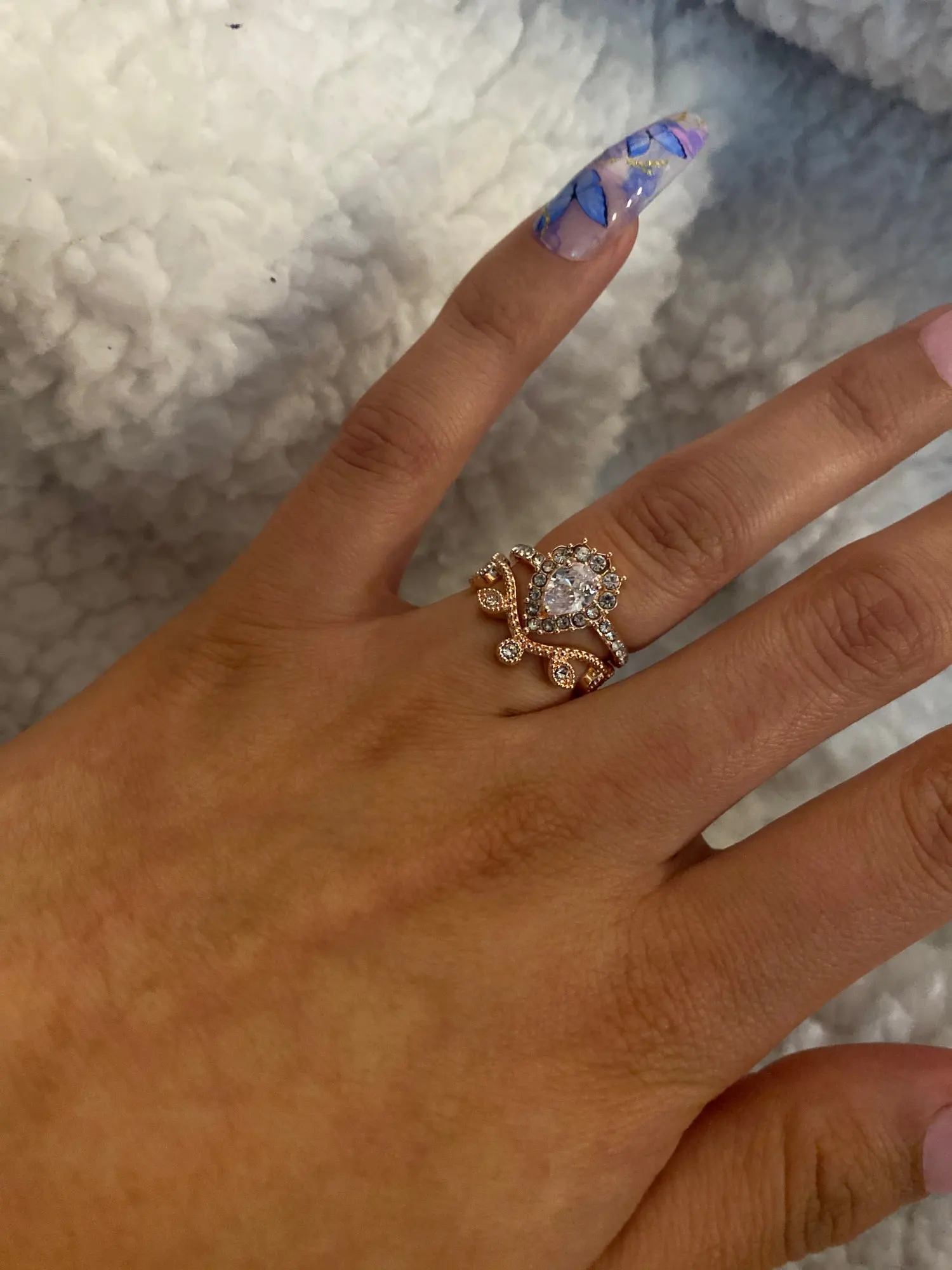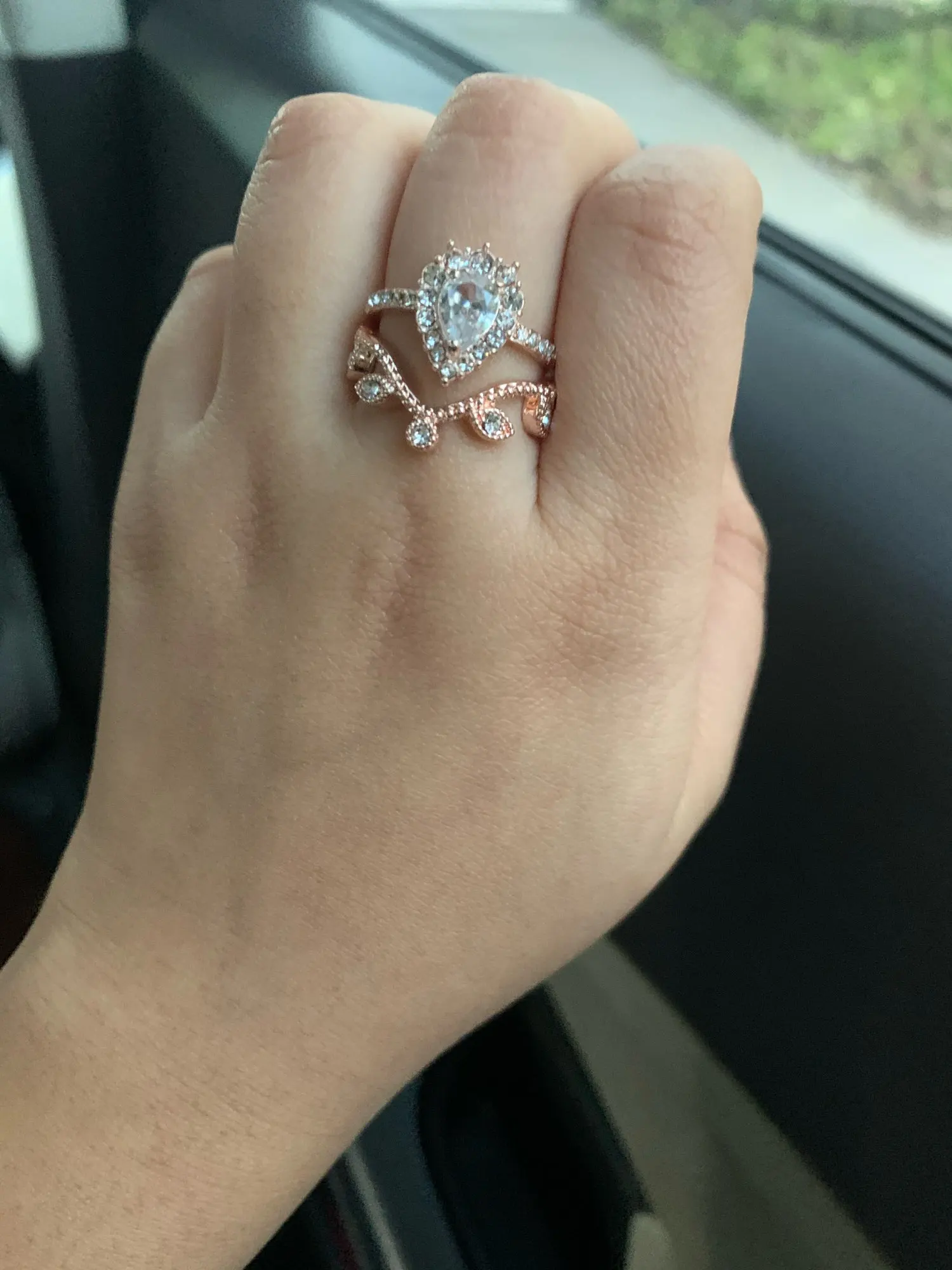 Это не кольцо, установленное на фотографиях. Они определенно украли эти фотографии и восстановили кольца с использованием дешевых материалов. Однако вы получаете то, за что платите. Вы планируете использовать их, чтобы предложить или попробовать пройти эти кольца как настоящие, я бы не хотел покупать их. Металл совсем не выглядит как розовое золото. Выглядит как дешевая медь. Фианит также не является высококачественным, он действительно дешевый и будет облачным после нескольких вещей. Если у вас есть аллергия или чувствительная кожа, это не так. Если вы просто ищете дешевые, но красивые ювелирные изделия, я бы порекомендовал их. Они не выглядят реальными, но вы снова платите за них пару долларов. Они красивые и хорошие по цене. Я ставлю 3 звезды. Я получил свои товары через полтора месяца после заказа.