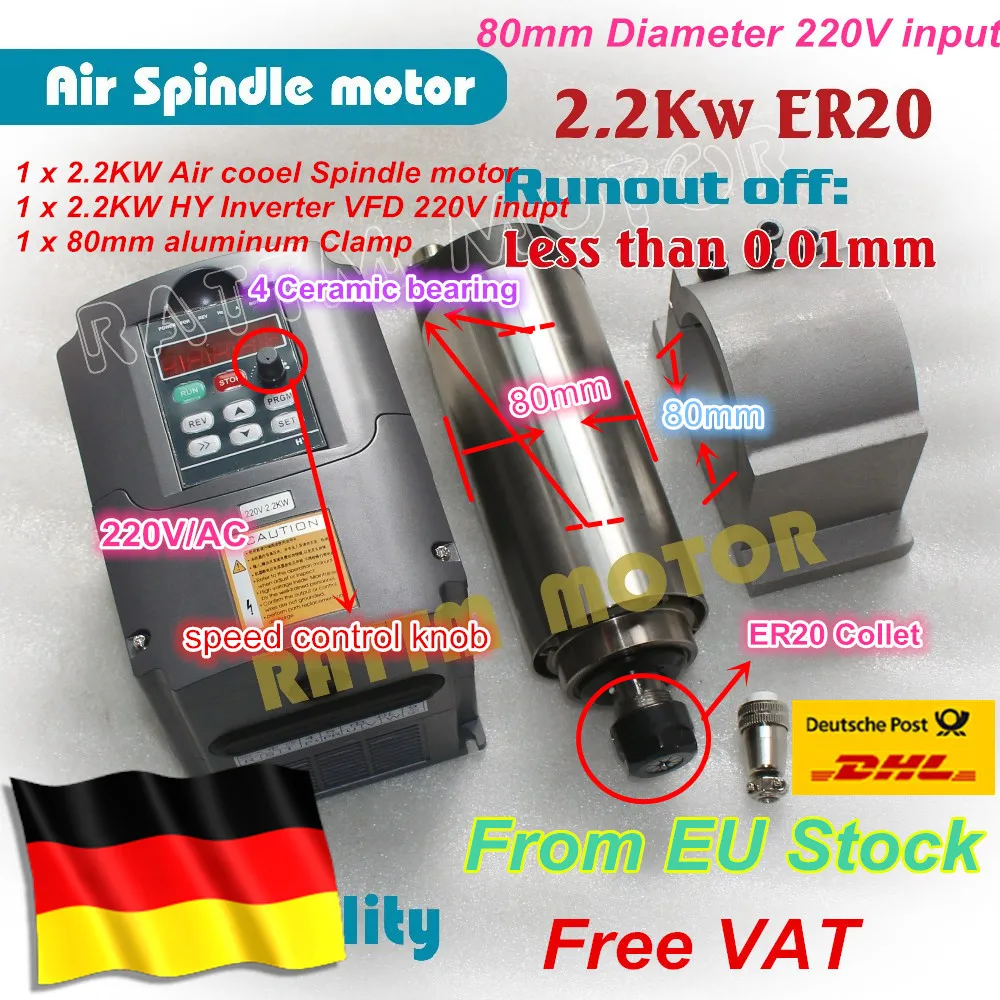 Двигатель шпинделя с воздушным охлаждением европейского стандарта, 0,01 КВТ, runoff ER20, 220 мм, кВт, VFD, В, инвертор и 80 мм зажим алюминия для фрезерного станка с ЧПУ