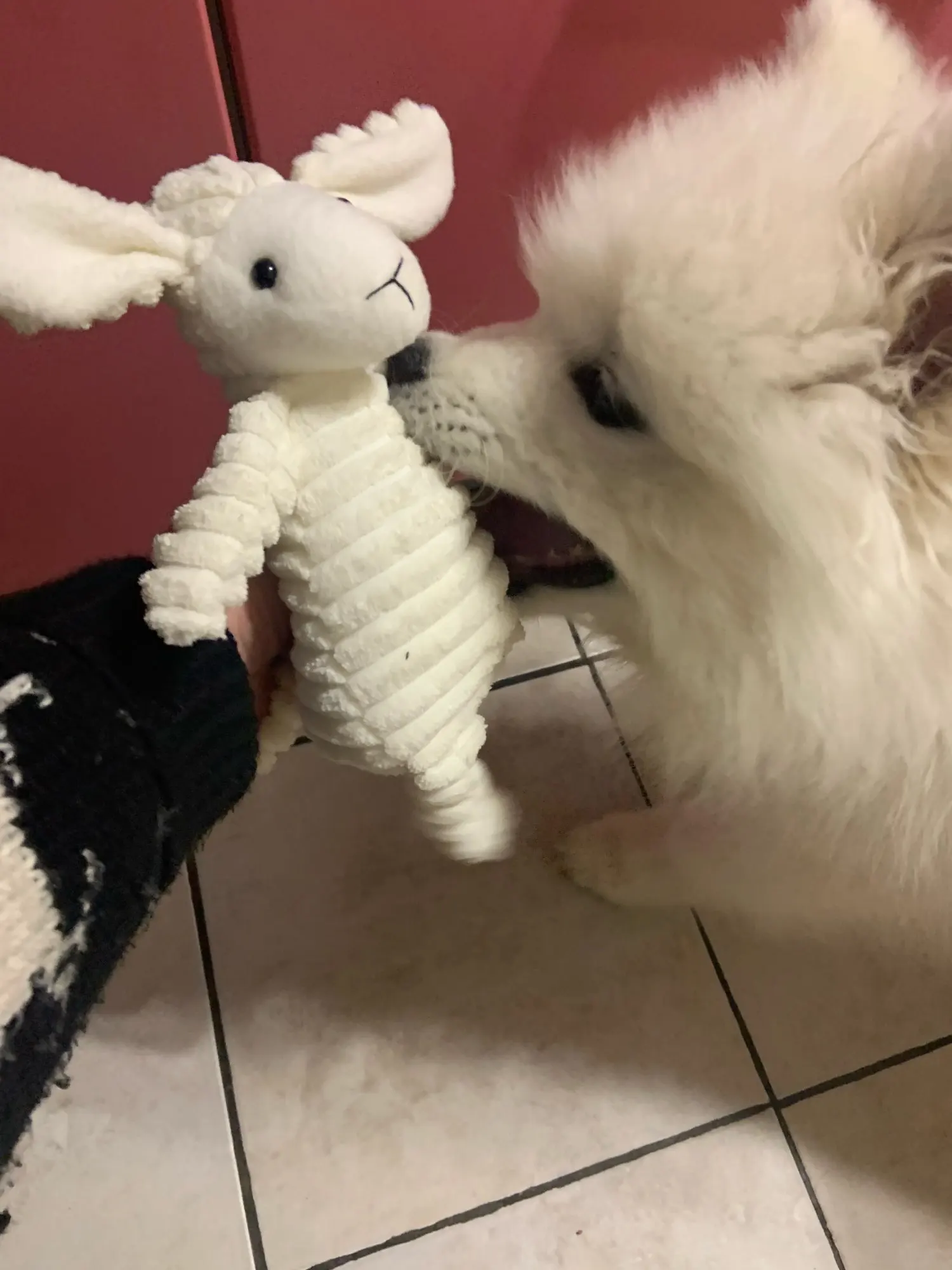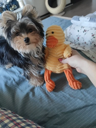 Good product, accurate description. The Toy is very cute, and my babygirl Bella just loves it. The material is thick and soft. The only problem I had was that the stitches were broken în The mid section of the back, probably the place where the squeaker was inserted. But I stitched it back fast and now my girl plays with it all day long. It took about 7 weeks to arrive in Romania. I am very satisfied with this, and I will definitley buy again from this shop. Thank you seller!