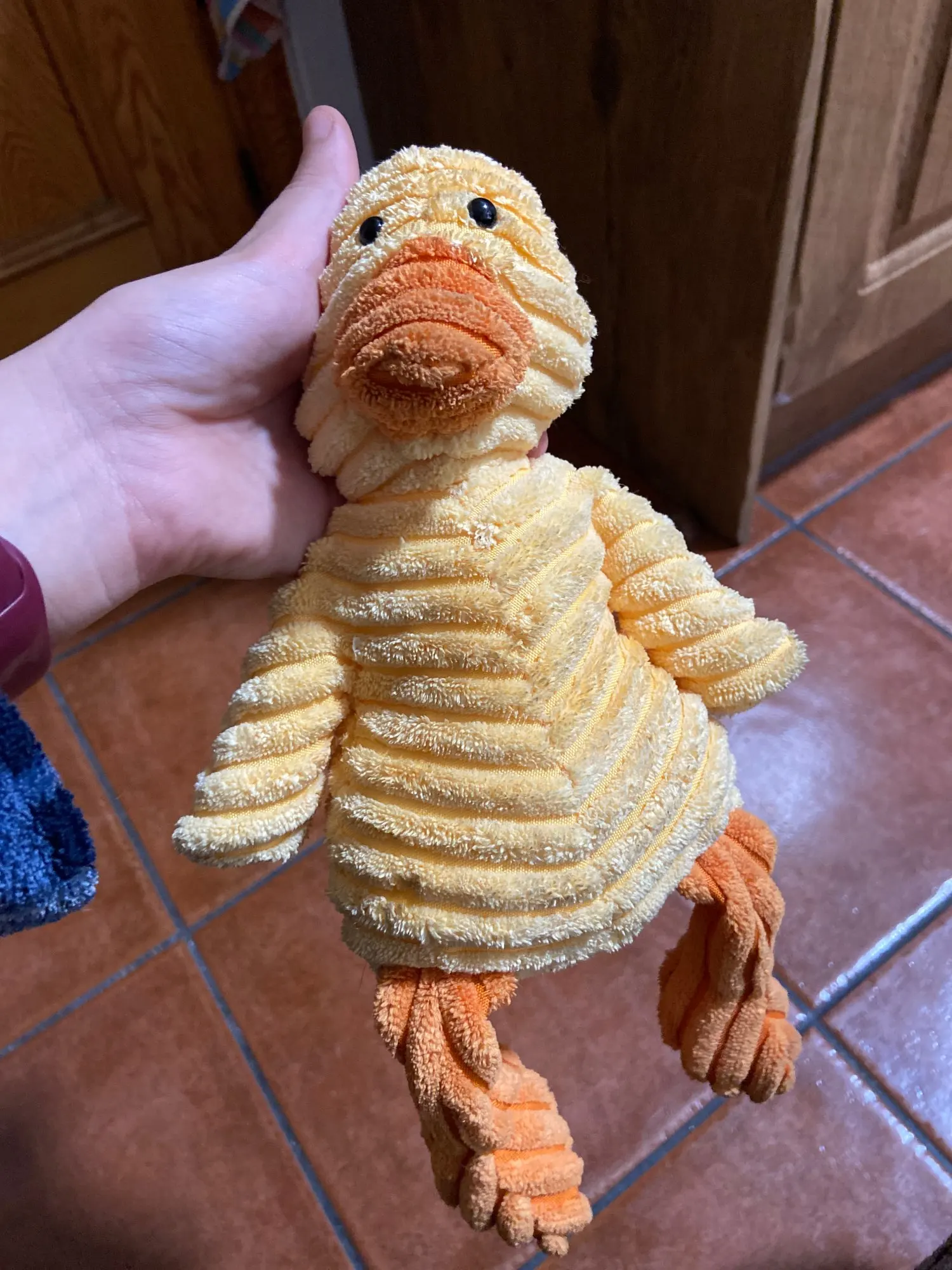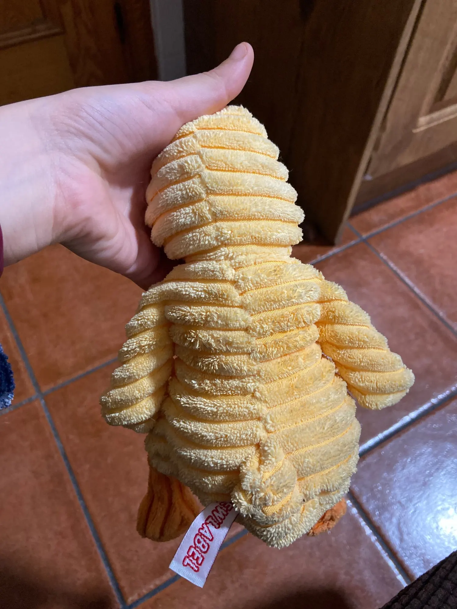 Очень хорошо сделано; Мягкий материал, хорошо прошитый. Пищалка расположена в области живота. Очень упаковано с начинкой в точку, где она имеет много/любой сжимается, что делает невозможностью для кошек и маленьких собак, чтобы укусить. Я отстегну швы, чтобы уменьшить количество набивки.