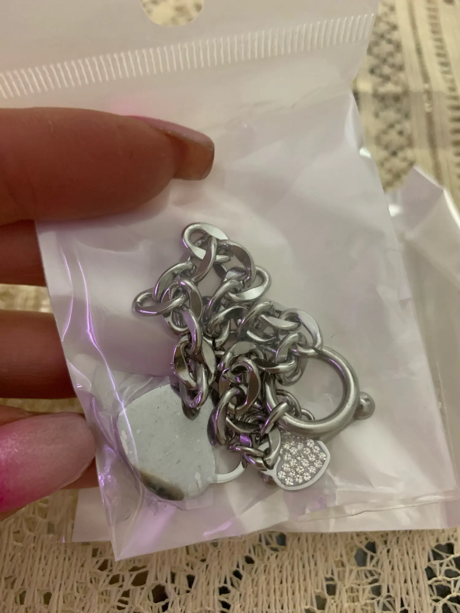 посылка дошла за 23 дня, упаковано в индивидуальные кулечки, очень красивый браслет со стразами и сердечками, смотрится на руке отлично, застёжка удобная необычная, не ожидала ,что бижутерия может быть такая красивая, спасибо продавцу!