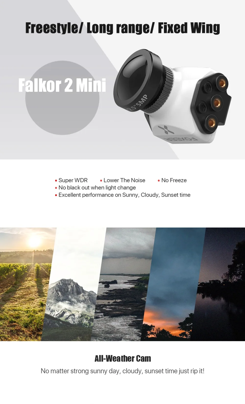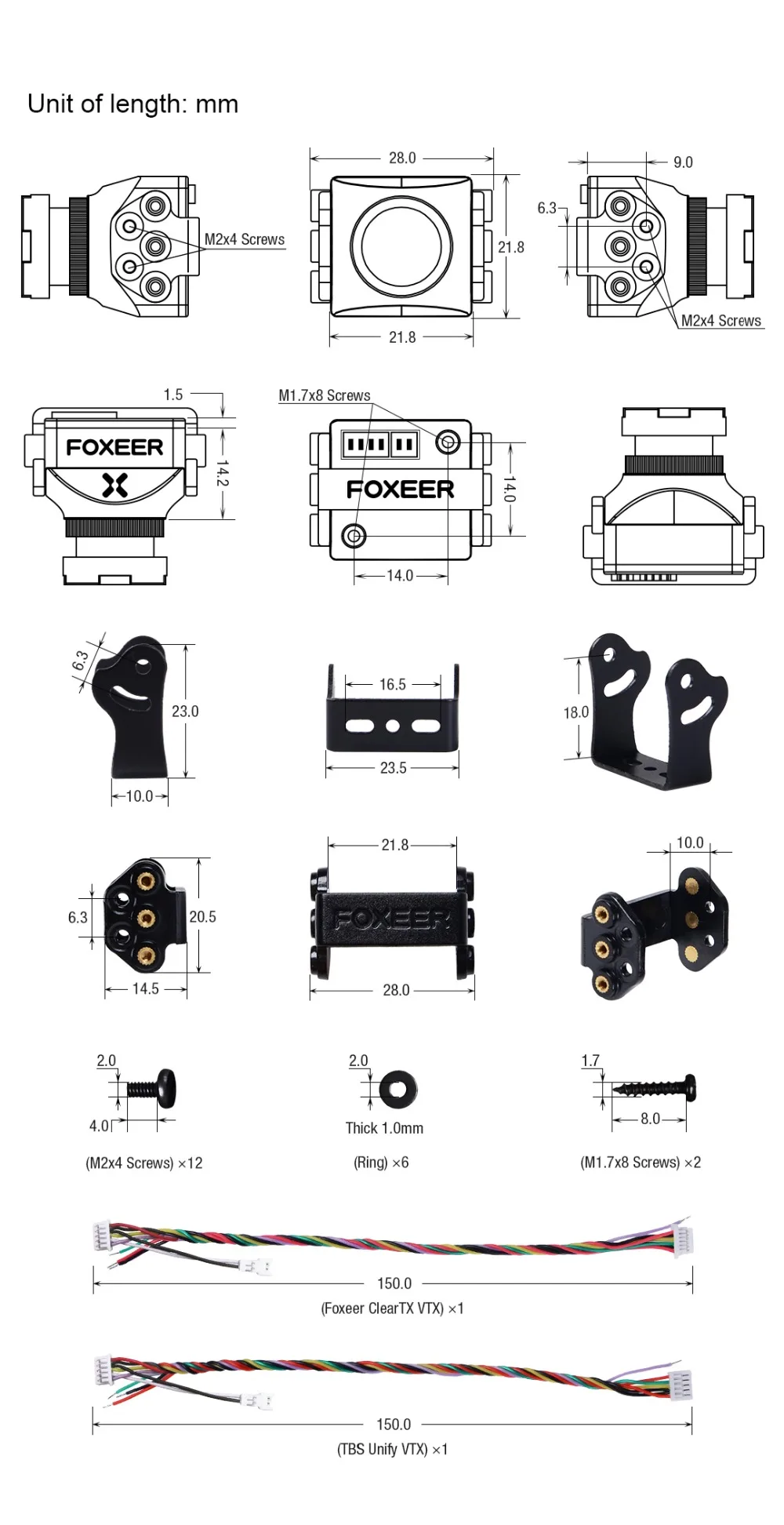 Название бренда: Foxeer Наименование товара: Falkor Цвет: черный, белый, красный, синий (по желанию) Размер: 1,8 мм, 2,5 мм (опционально) Тип датчика: CMOS 1/3 Масштаб: переключаемый 4:3 / 16:9 ТВ система: PAL / NTSC переключаемый Разрешение: 1200TVL Скорость затвора (CCD IRIS): PAL: 1/25 ~ 1/10000 сек; NTSC: 1/30 ~ 1/10000 сек Видео выход: CVBS Мин. Освещение: 0.01Lux Баланс белого: Авто DNR: 3DNR WDR: 100 дБ Дневная/ночная смена: EXT/Auto/Color/B & W Полет OSD: напряжение/название камеры/время Требования к питанию: 5 В ~ 40 В постоянного тока Язык: английский/Pyccknn/Espanol/Italiano/Francais/Polskzm/Portugues/японский Рабочая температура: -10 ~ + 50 RH90 % Макс Рабочая влажность: 20 ~ 80% Температура хранения: -20 ~ + 70 Влажность хранения: 20 ~ 95% Размер: 28x26мм Вес: 13,5 г Особенности: 4 цвета на выбор: белый, черный, синий, красный. 2 размера линз на выбор: 1,8 мм, 2,5 мм Переключаемый 4:3/16:9, переключаемый PAL / NTSC Всепогодная камера с автоматической адаптацией окружающей среды. Поддержка дистанционного управления камерой. Хорошая производительность на светодиодный светильник. Жгут видео и OSD разделены. Посылка включает в себя: 1 камера Foxeer Falkor 1x Серводвигатель для Foxeer ClearTX VTX 1x Серводвигатель для TBS Unify VTX 1x 2pin OSD кабель 1x плата OSD 1x кронштейн 1x Руководство пользователя 1 комплект винтов