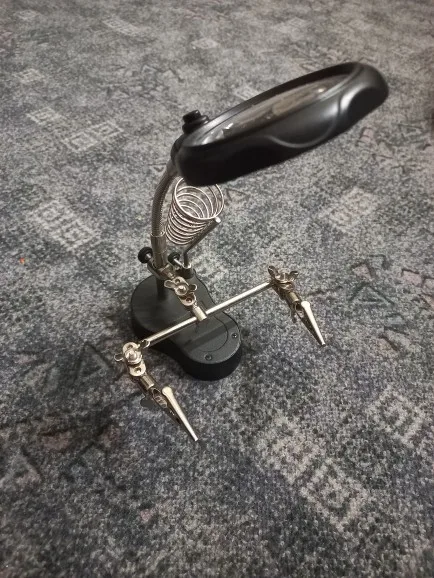 В Украину пришло за месяц. Коробка порвана и помята, но все целое, так как было в разобранном виде, батарейки- 3 шт. ААА в комплект не входят. Конструкция вся собирается на шарнирах -хлюпенькая. На сколько удобно будет с ней паять, пока не могу сказать. Два светодиодика светят довольно ярко. С продавцом не общался.