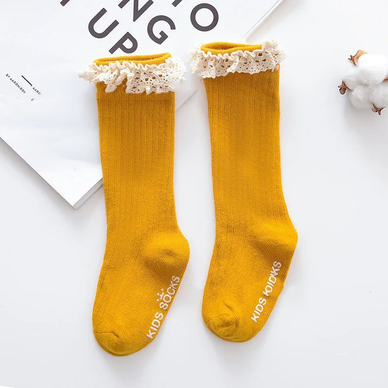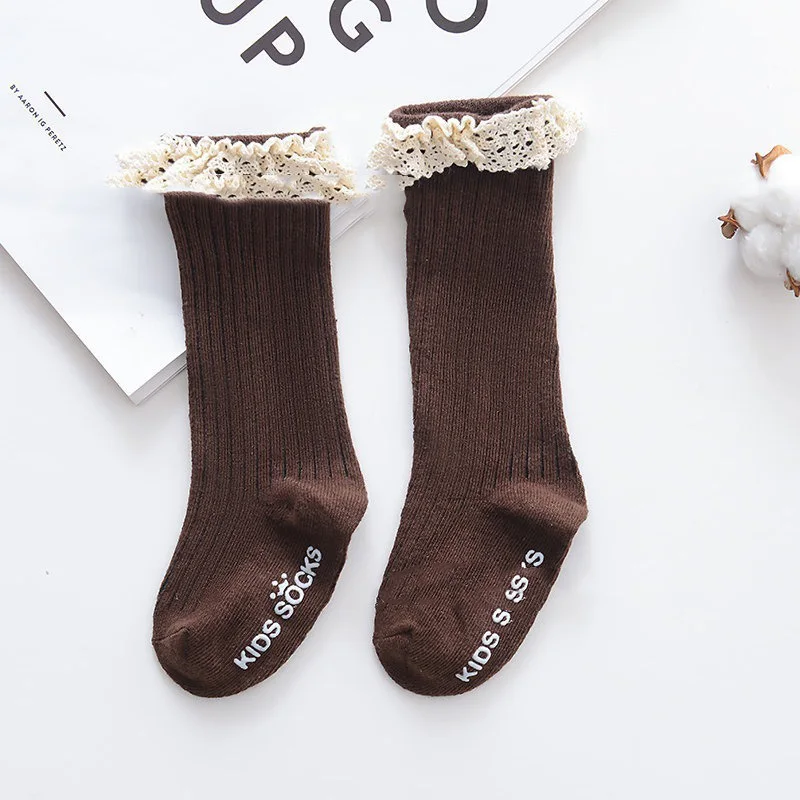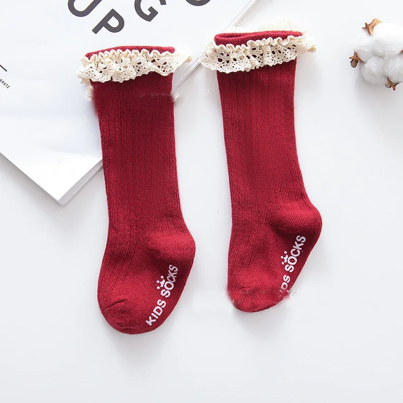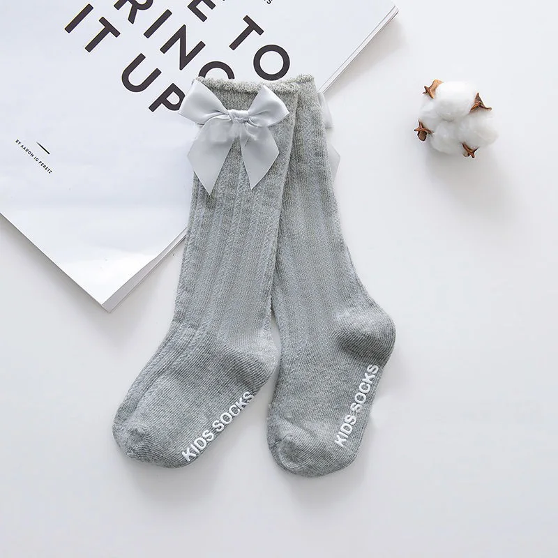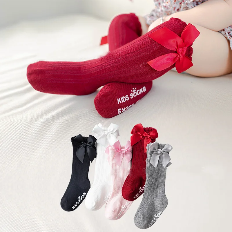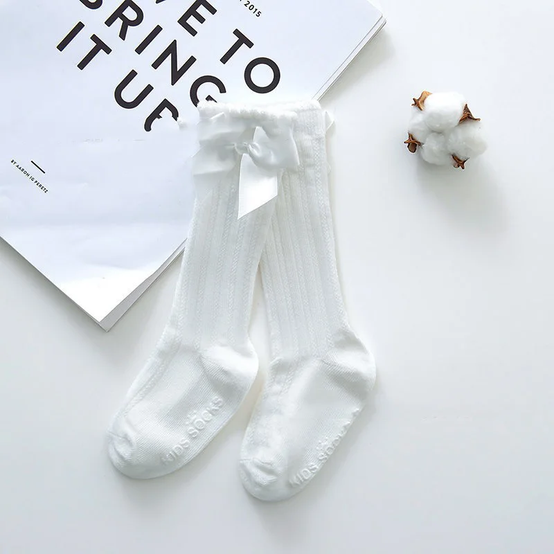 Новинка, одноцветные Полосатые чулки для девочек, Чулки с пузырьками, Детские хлопковые нескользящие чулки с бантом для малышей, кружевные чулки