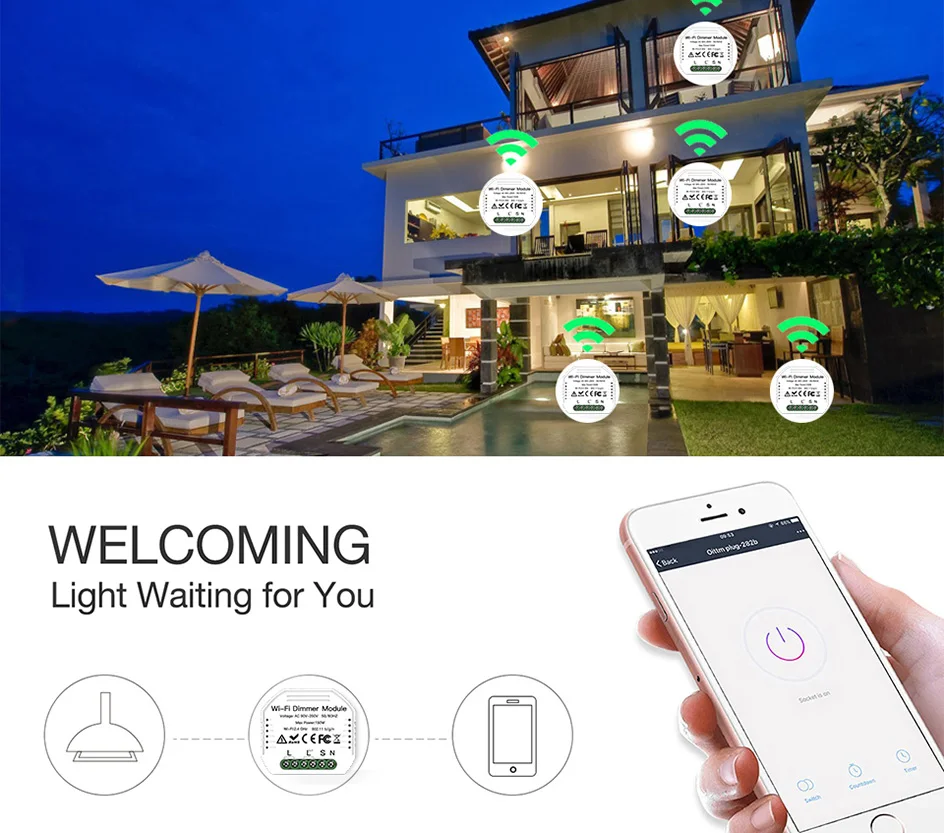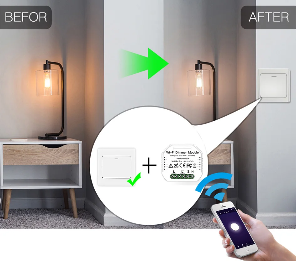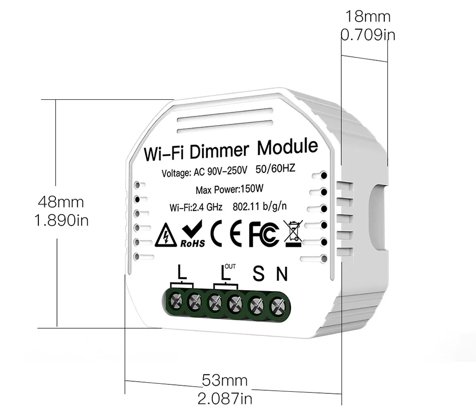 1/2 Way Wifi умный диммер выключатель модуль беспроводной пульт дистанционного управления Tuya Smart Life приложение Голосовое управление настенный светодиодный светильник выключатель диммеры выключатель работа с Google Assistant Alexa Echo Примечание: модуль диммера подходит только для переключателя сброса Основная особенность: 1. Легко заменить традиционный переключатель, чтобы сделать его умным: может сделать ваше существующее 2 way переключатель умный также, просто установите 1 diy смарт-переключатель, подходит для ЕС/Великобритании переключатель коробки. Пожалуйста, подтвердите размер перед заказом. 2. 0%-100% затемнения: Отрегулируйте светильник с помощью Голосового ассистента, например Amazon Alexa, Google Assiatant или через ваш мобильный телефон. 3. Управление Wi-Fi через ваш мобильный телефон: сети 2,4G обеспечивают необходимое подключение к модулю DIY Switch без концентратора. 4. Использует популярное приложение smart life/Tuya на базе android / ios, универсальное приложение позволяет полностью контролировать свет или совместимые устройства. Несколько вариантов программы позволяют спланировать точное время для включения света/вентиляторов/и т. Д. Включение/выключение автоматически 5. Дайте вашим устройствам максимальную мощность вкл/выкл умный макияж, просто подключите этот модуль Do-It-Yourself между вашим устройством и источником питания, чтобы преобразовать большинство любых совместимых продуктов в умный. Основные характеристики: Входное напряжение: 90 В ~ 240 В/50 Гц Проводка: прямой провод и нейтральный провод Максимальная мощность нагрузки: 150 Вт (светодиодный) Wi-Fi, Стандартный: 2,4 ГГц 802,11 b/g/n Название приложения: Tuya Smart / Smart Life Срок работы: 100000 во время проведения операции Размер: 51x47x22мм Сертификация: FCC, CE, RoHS