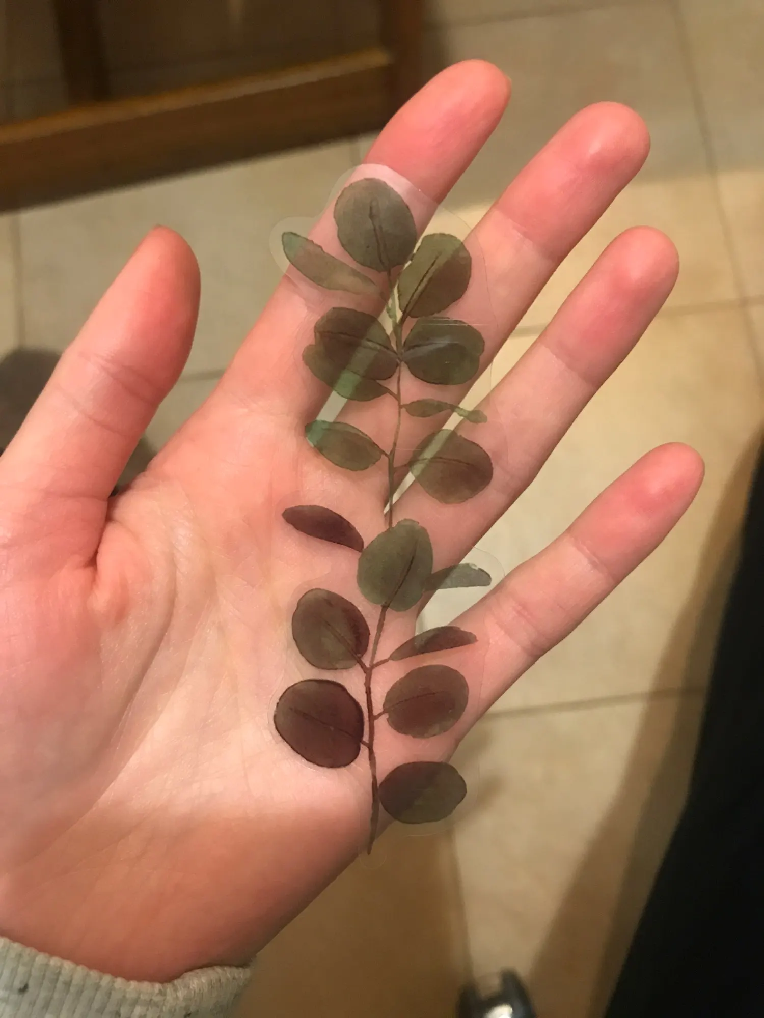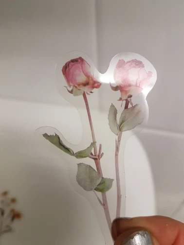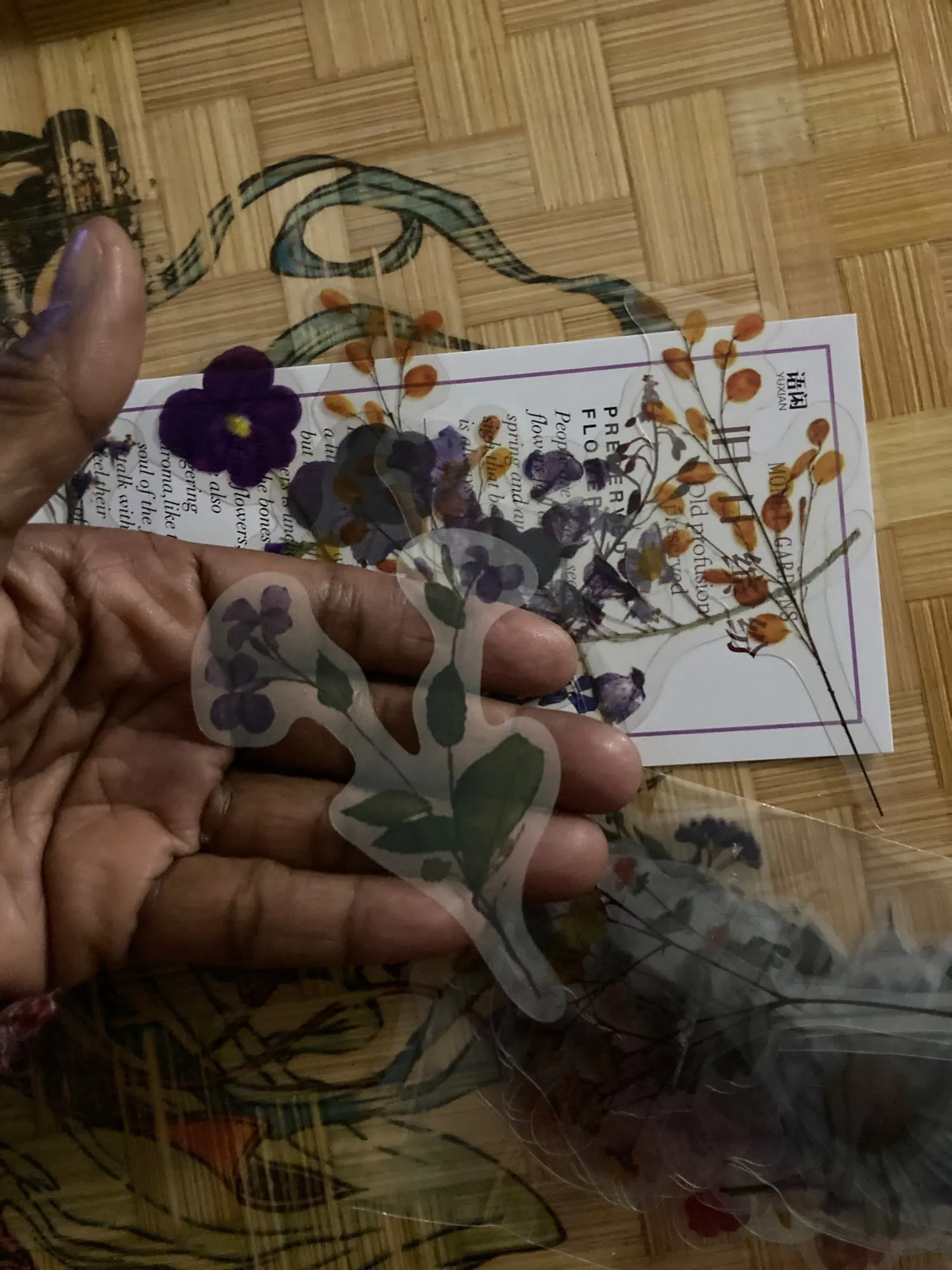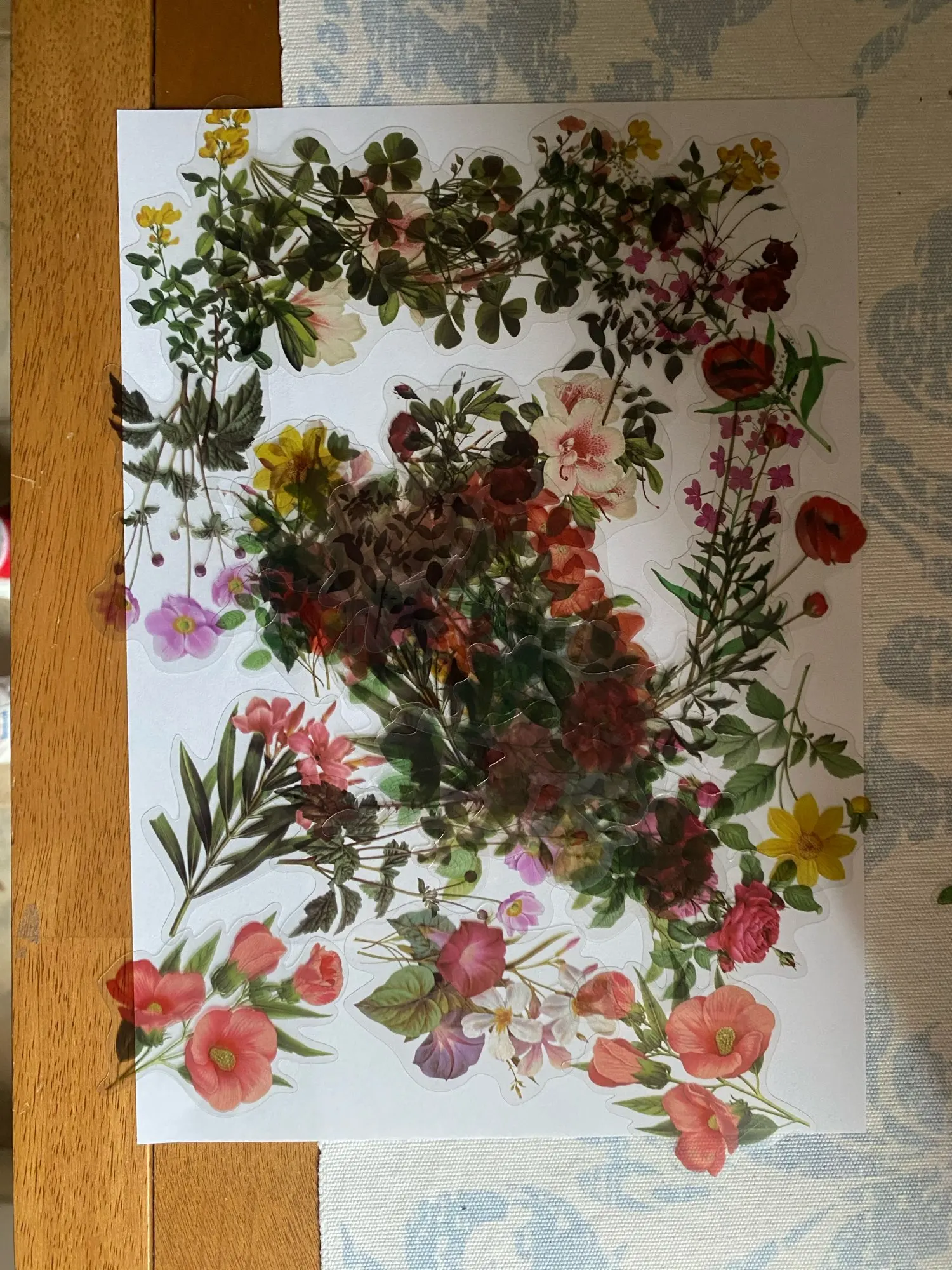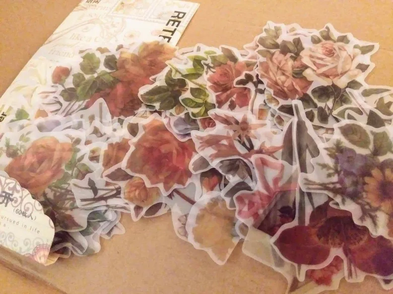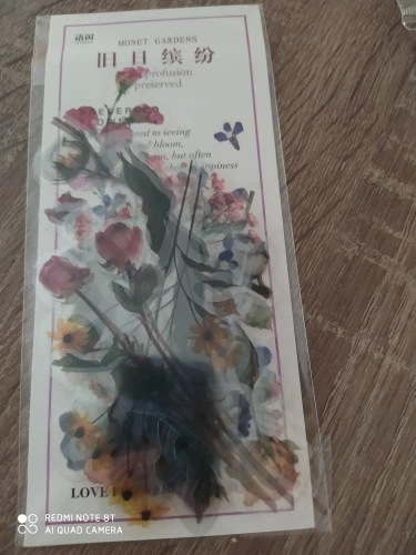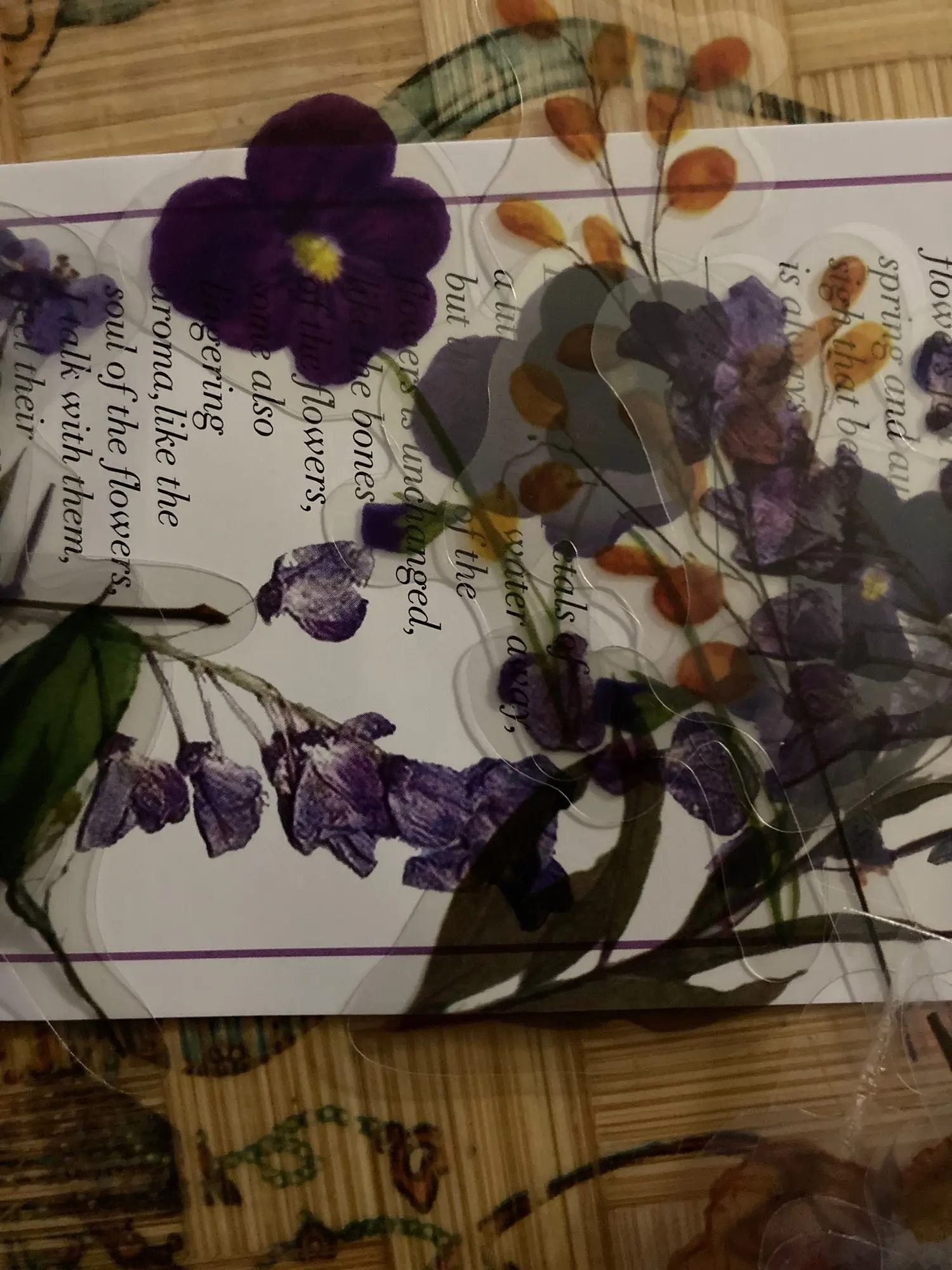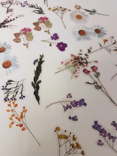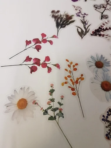 Они невероятно красивые! Они выглядят как настоящие прессованные цветы! Очень липкий! Будьте осторожны, чтобы разместить их правильно, почти невозможно перемещаться по бумаге, не уверены в других поверхностях. Я не могу сказать, какая сторона наклейки и какая задняя сторона.