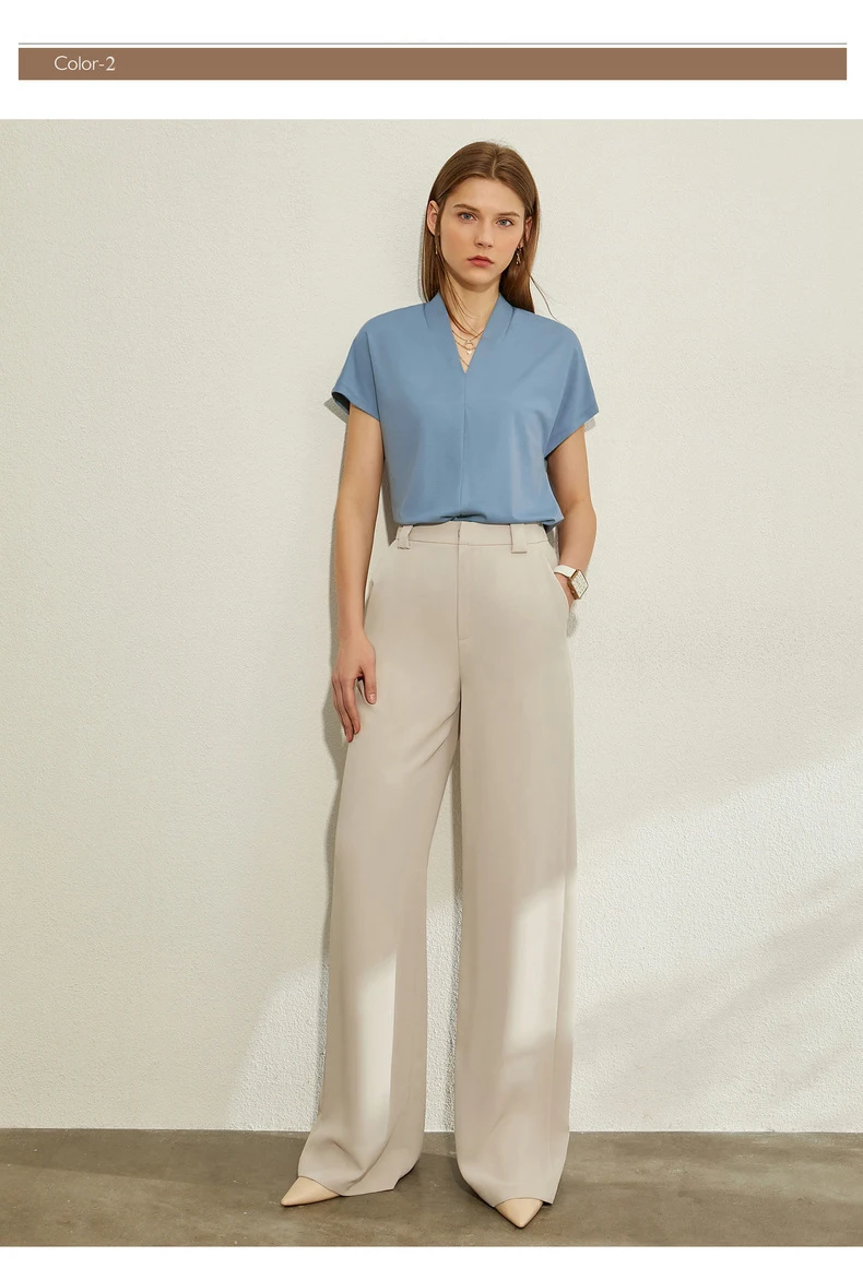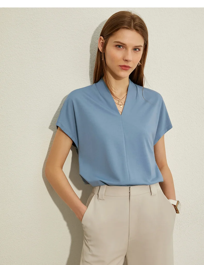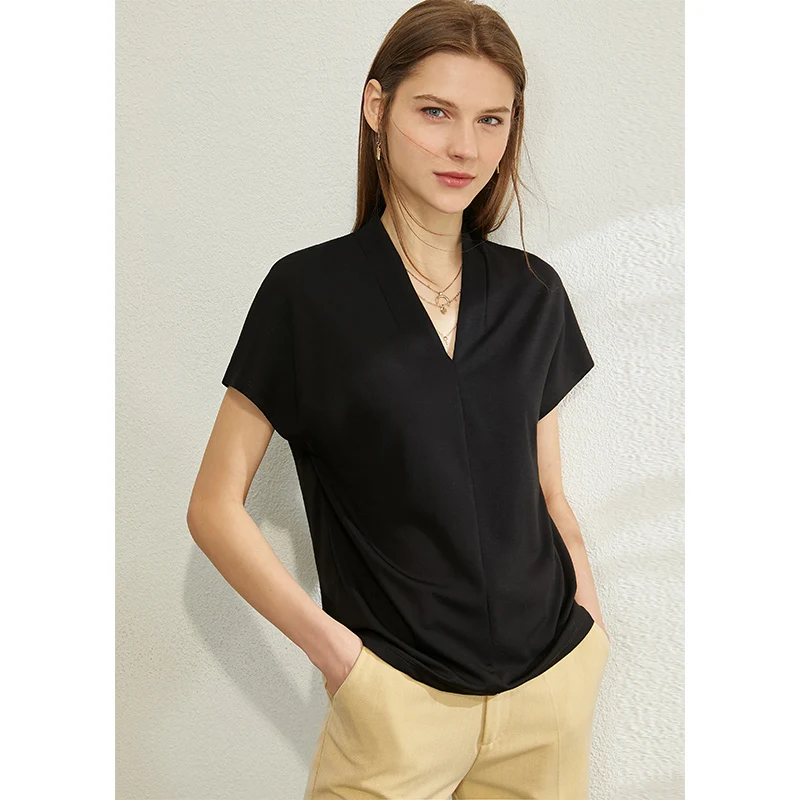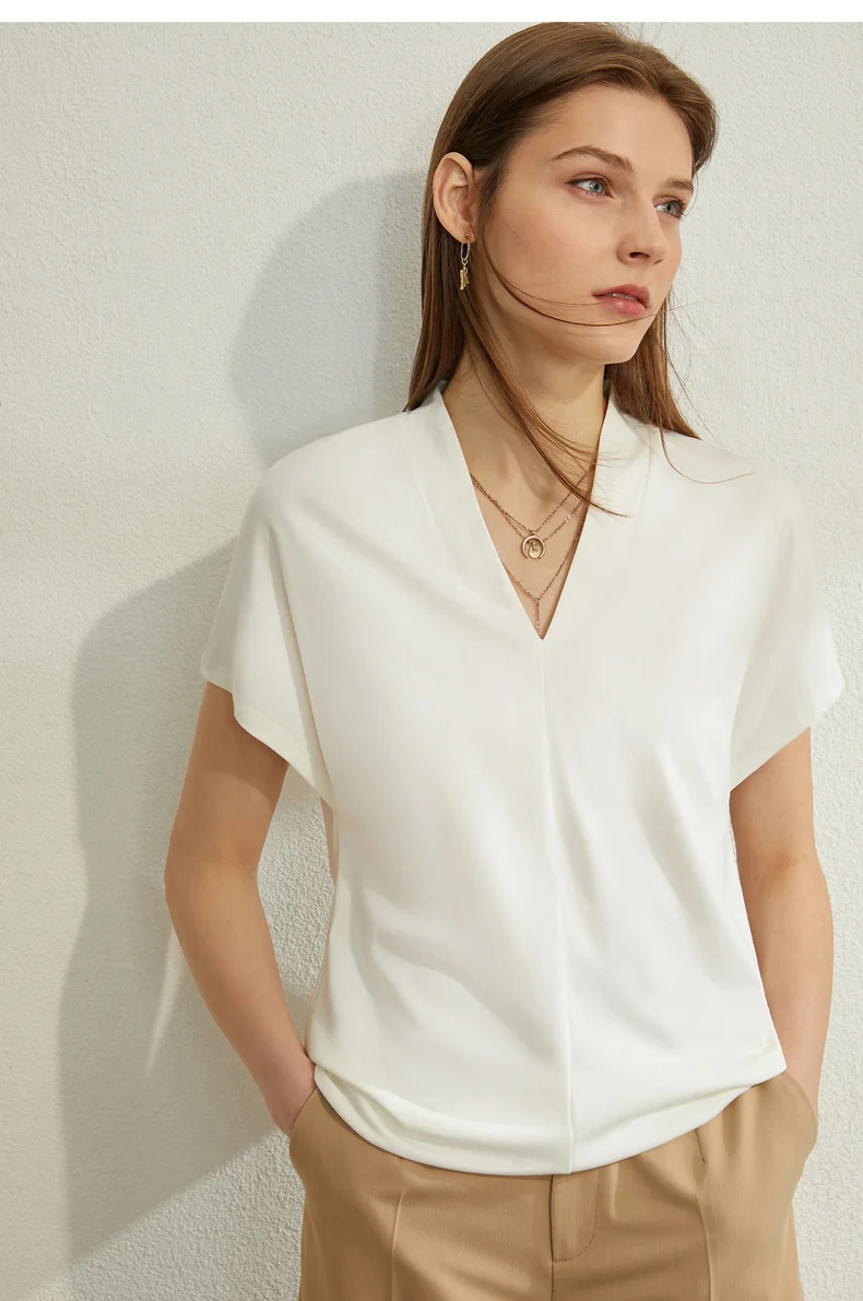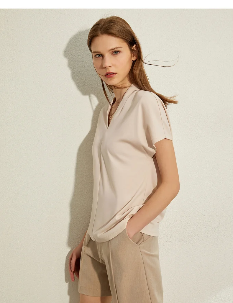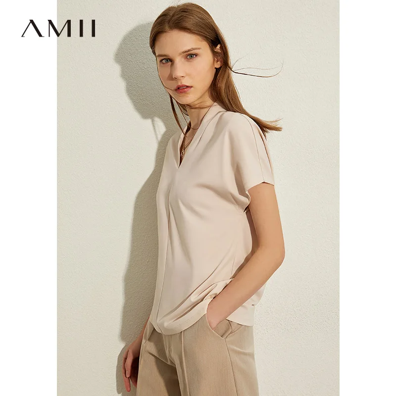 AMII минимализм; Сезон весна-лето; Шифоновые однотонные V образным вырезом Свободная Женская блузка на каждый день Повседневная рубашка с короткими рукавами Блузка 12060068