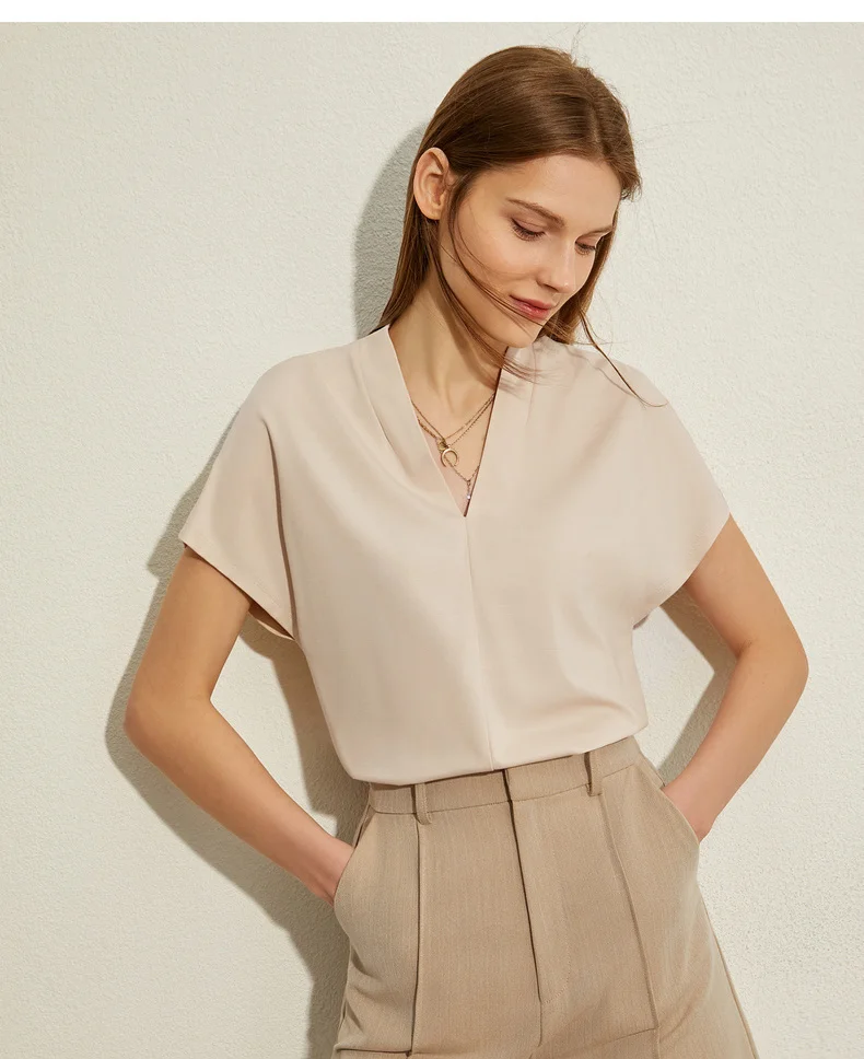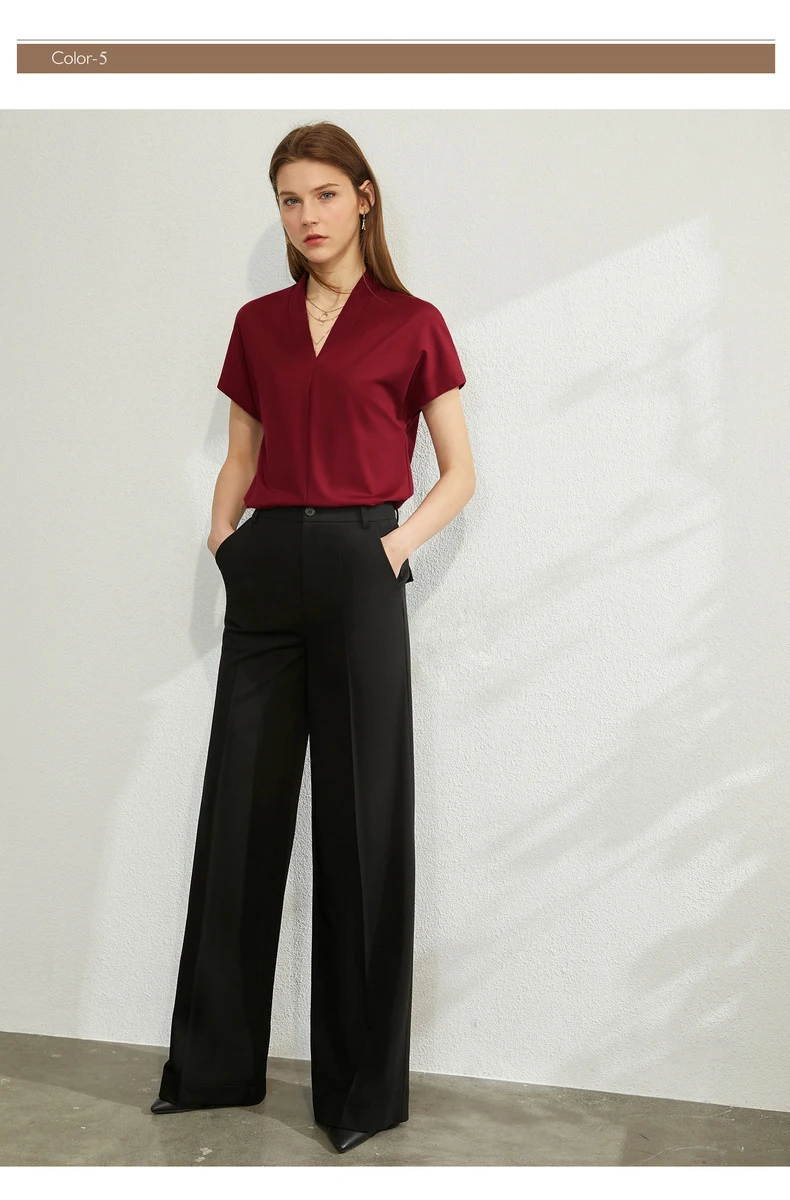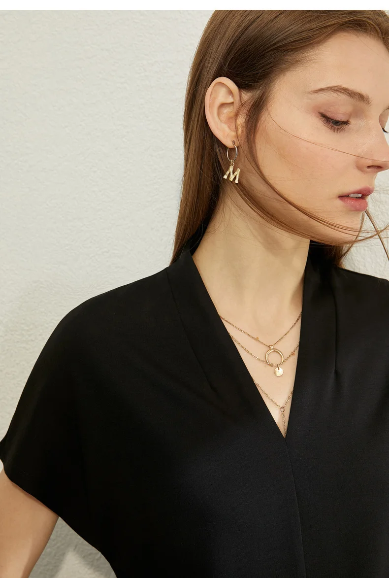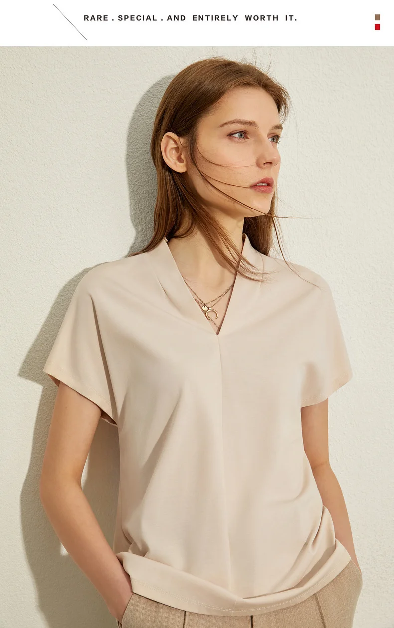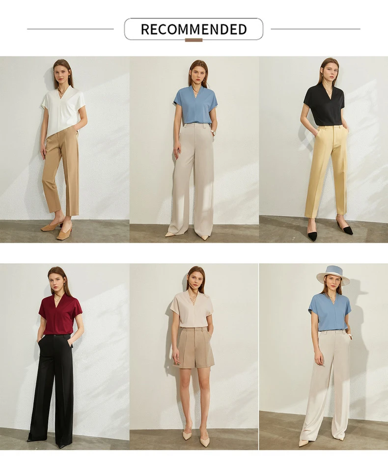 AMII минимализм; Сезон весна-лето; Шифоновые однотонные V образным вырезом Свободная Женская блузка на каждый день Повседневная рубашка с короткими рукавами Блузка 12060068