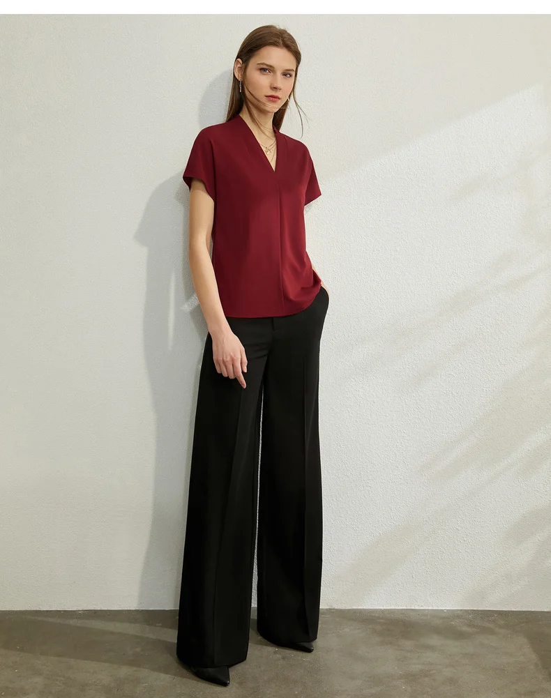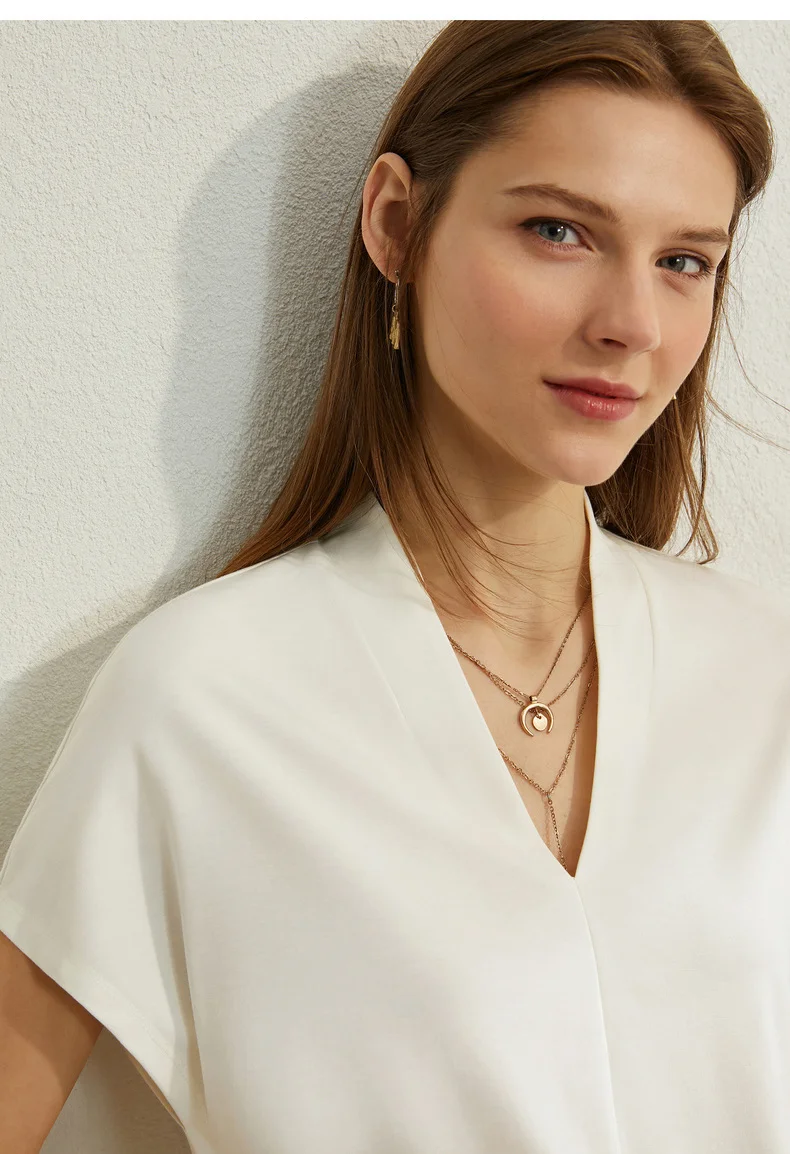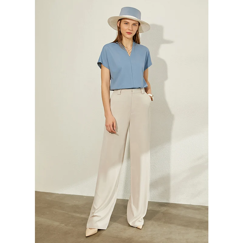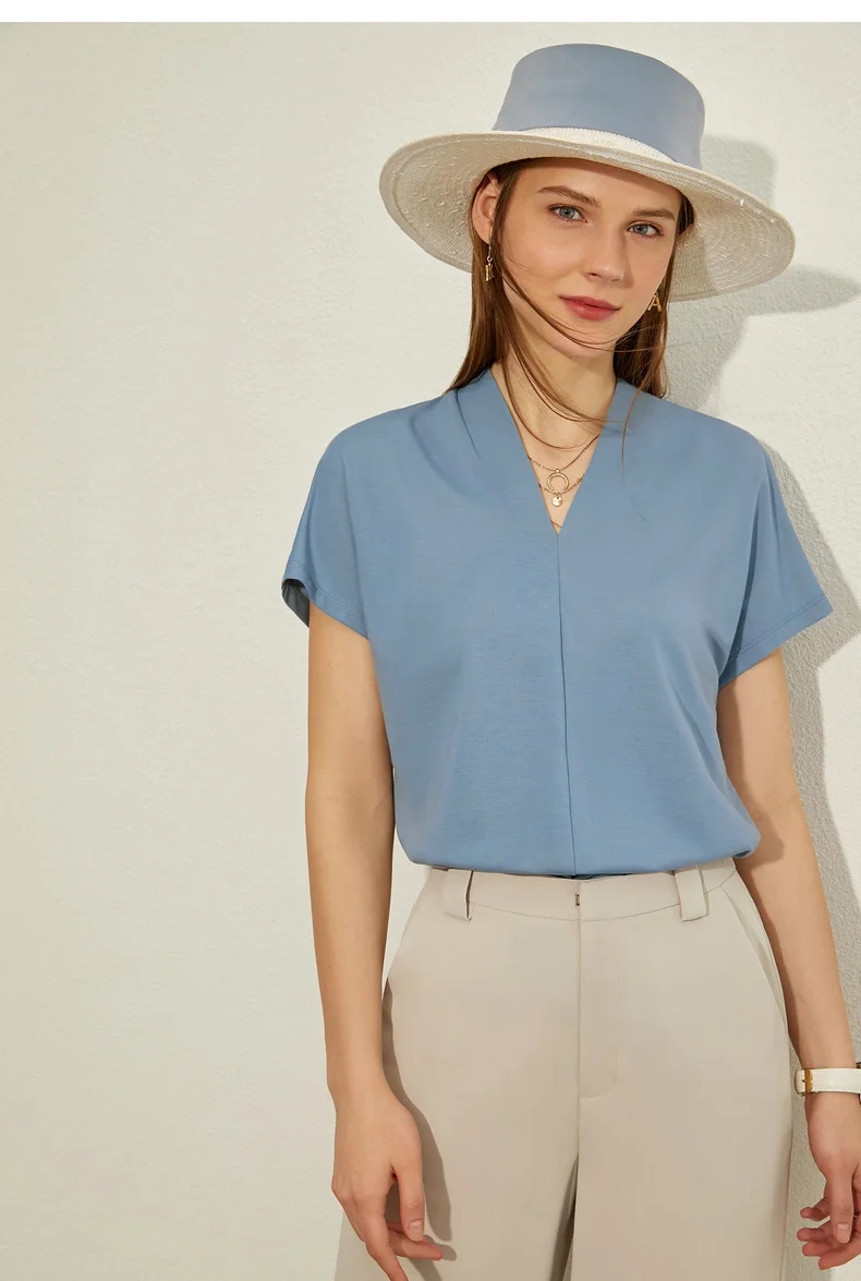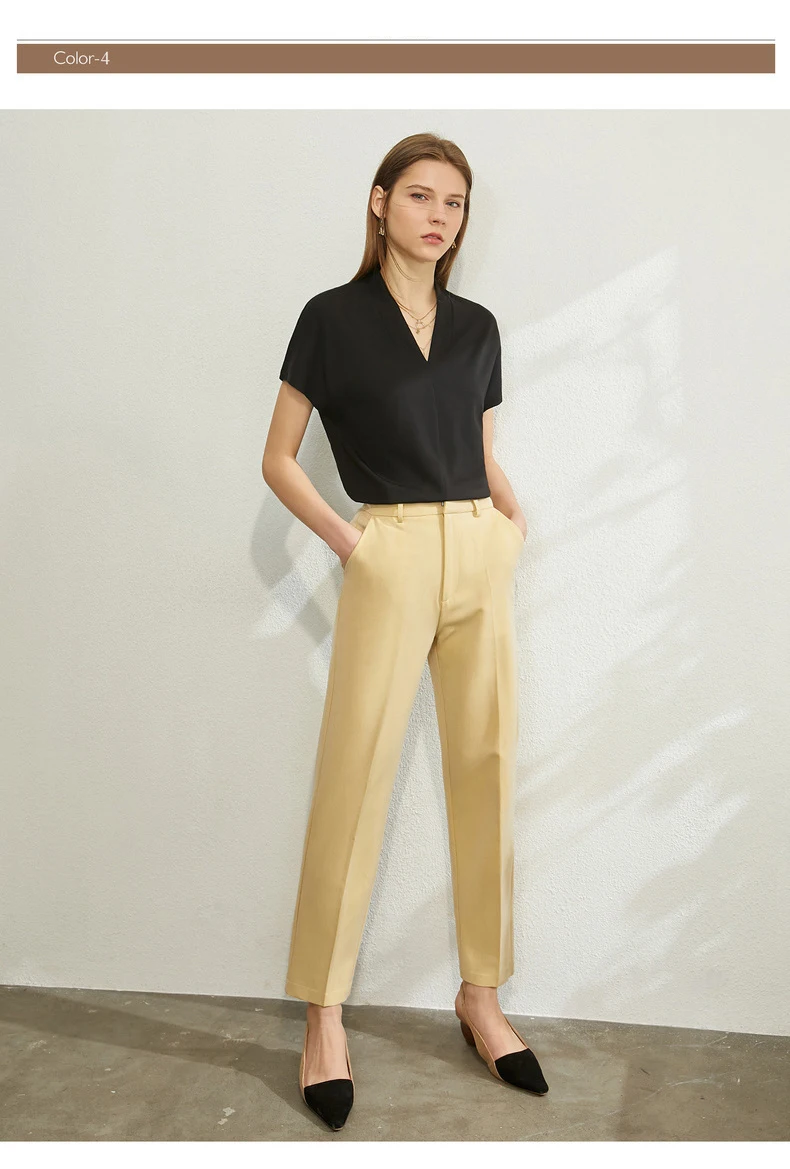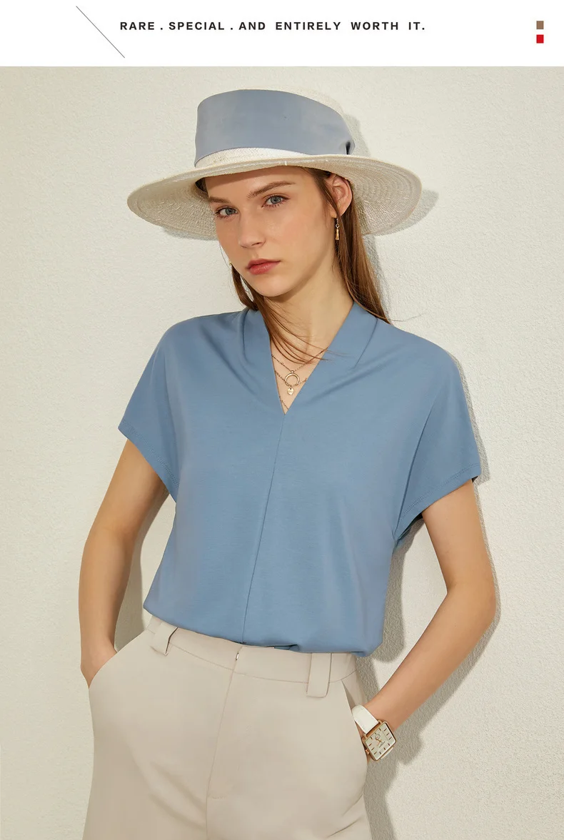 AMII минимализм; Сезон весна-лето; Шифоновые однотонные V образным вырезом Свободная Женская блузка на каждый день Повседневная рубашка с короткими рукавами Блузка 12060068