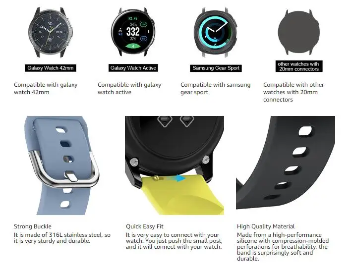 Совместимые модели: сменные полосы шириной 20 мм, совместимые с часами Samsung galaxy active/ active2 40 мм/44 мм, Galaxy watch 42 мм, gear Sport/ Gear S2 Classic/ Garmin Vivoactive 3/ Vivomove HR/ Forerunner 645/ Forerunner 245, также подходит для часов Gizmo (в комплект не входят умные часы)