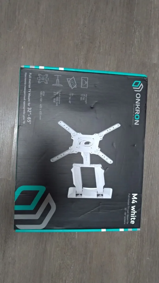 Быстрая доставка, хорошая упаковка. Выглядит надёжно, удобное крепление, приятный белый цвет. Очень мягкий, плавный ход у поворотного элемента. В комплекте есть все запасные винты. Хотя для крепления ответной части кронштейна (под VESA) предусмотрены неудобные для затяжки болты без ребер с внешней стороны. Повесил телевизор 55" (27 кг). К сожалению, я не опытный мастер, но все же смог смонтировать телевизор на стене крепко.