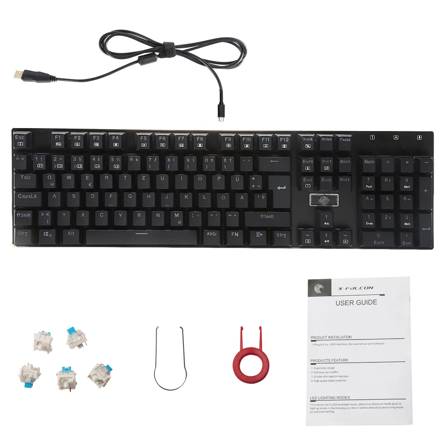 Package includesmechanical gaming keyboard , diy switches , keycap and switch puller