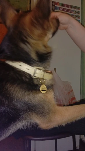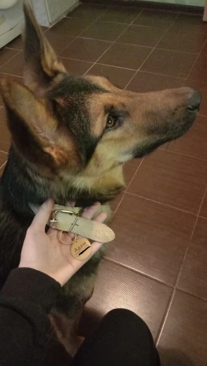 Всё как в описании. Текст совпадает, смотрится красиво. Он не напечатан, а выгравирован. Для немецкой овчарки подошло.