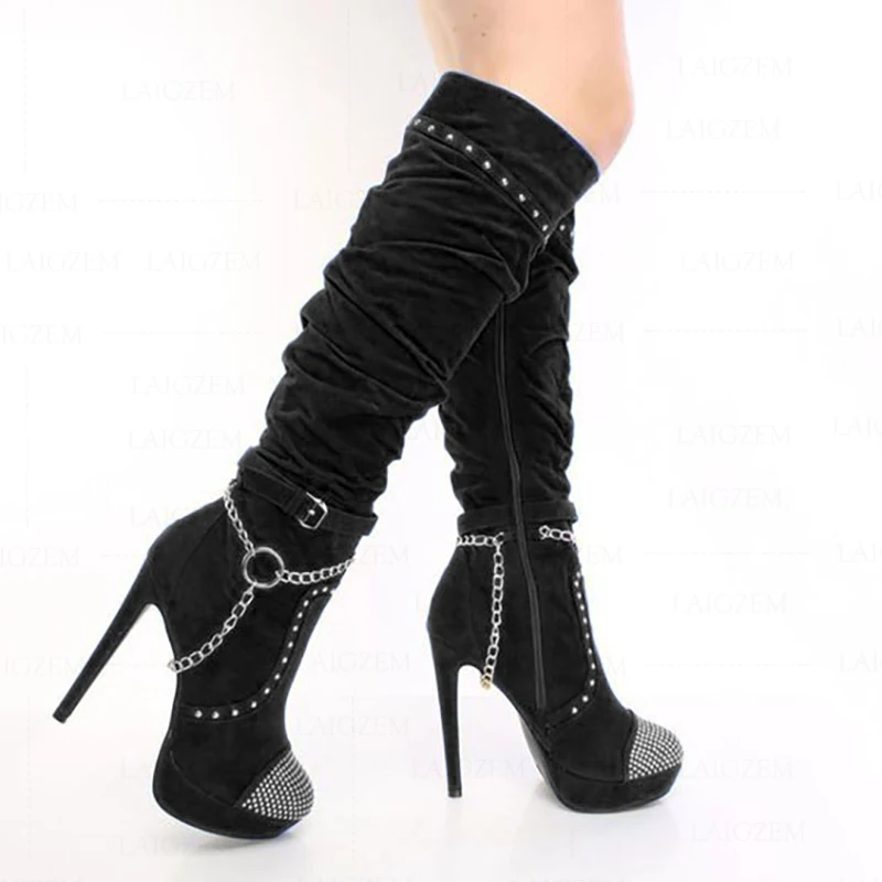 Женские сапоги до колена из искусственной замши, с цепочкой и молнией сбоку