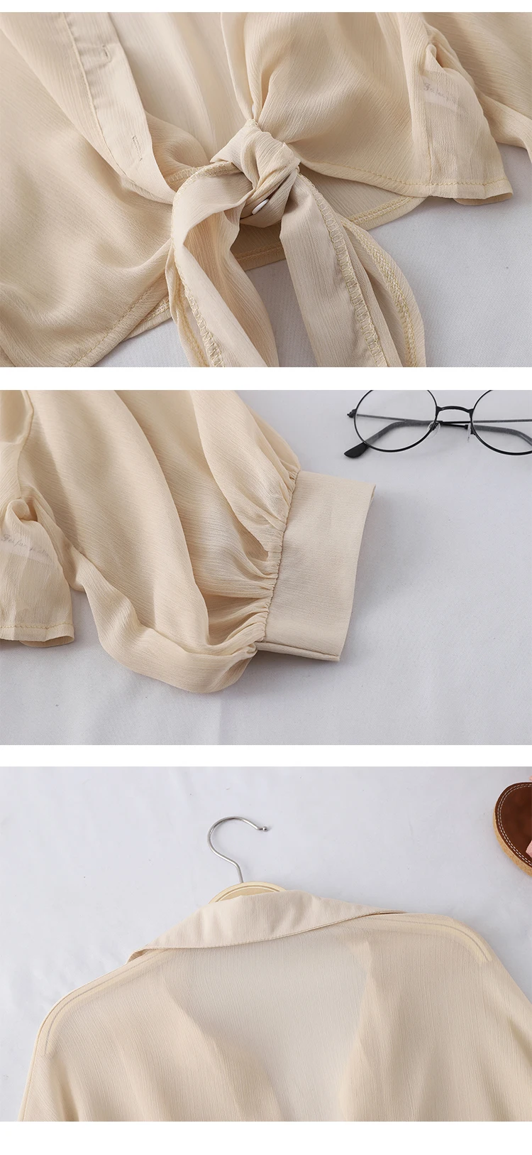 Женские шифоновые рубашки Pearl Diary, с рукавами-шариками, на пуговицах, Пляжная накидка, прозрачный топ, с завязками спереди, на талии, элегантные пляжные Топы