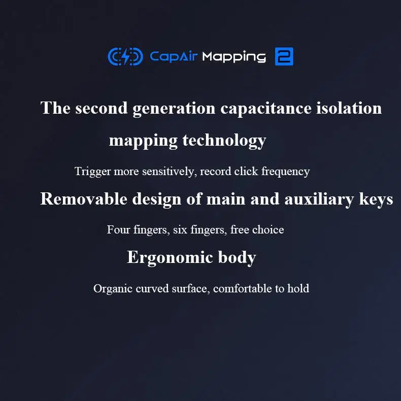 The second generation capacitance isolation mapping technology Trigger more sensitively, record click frequency Removable design of main and auxiliary keys Four fingers, six fingers, free choice Ergonomic body Organic curved surface, comfortable to hold