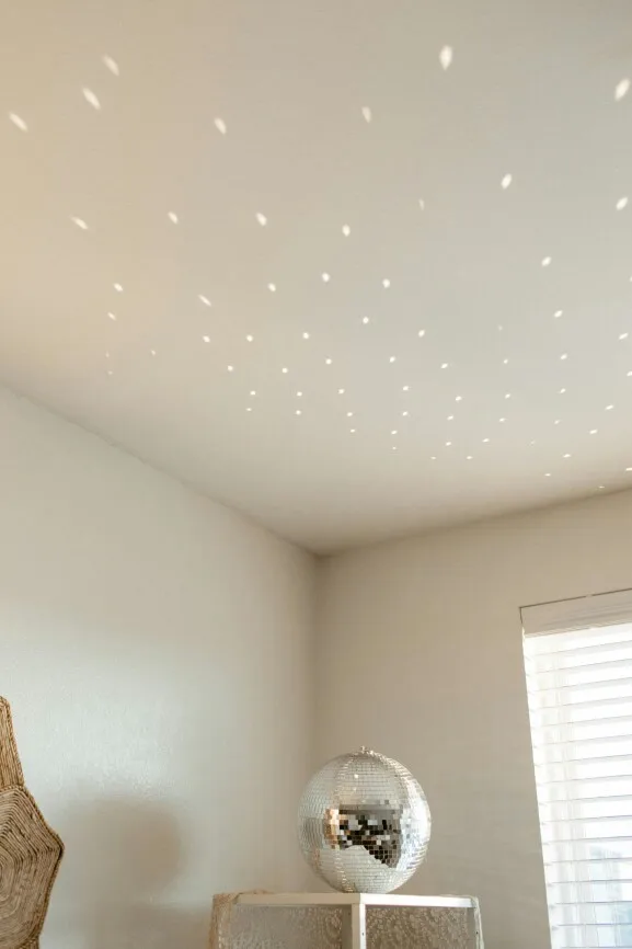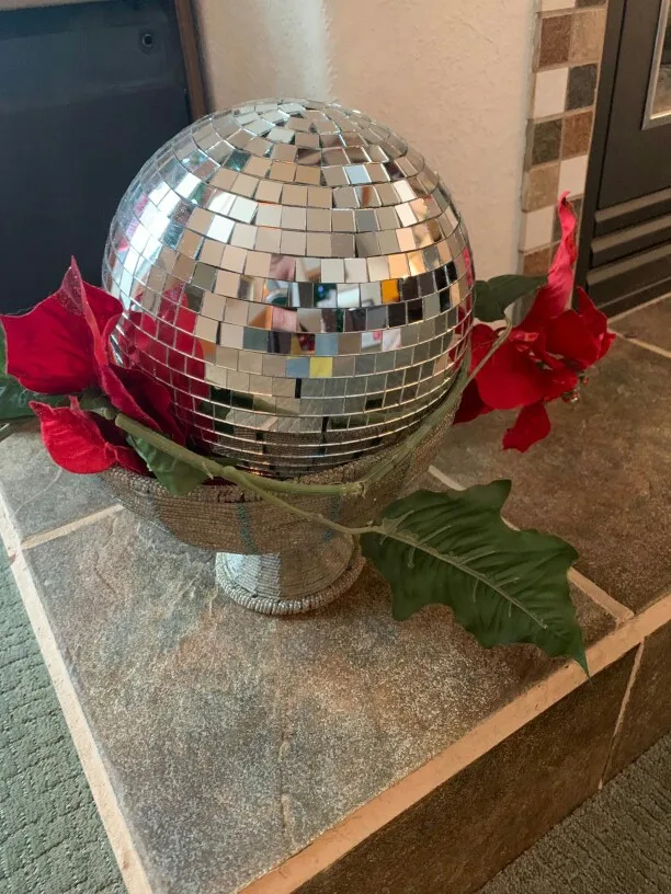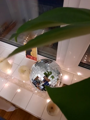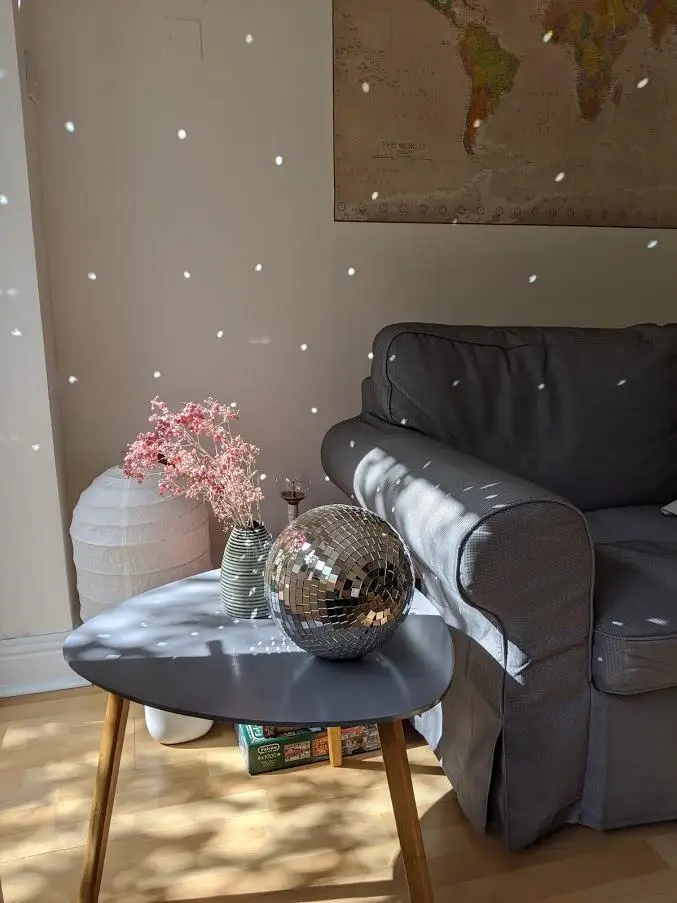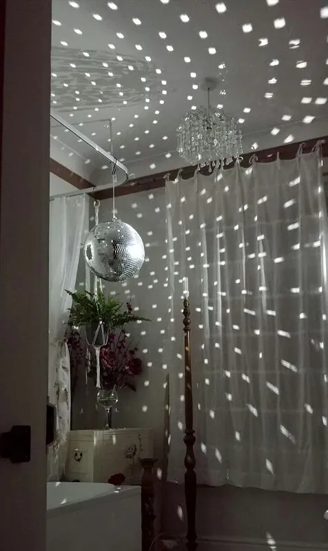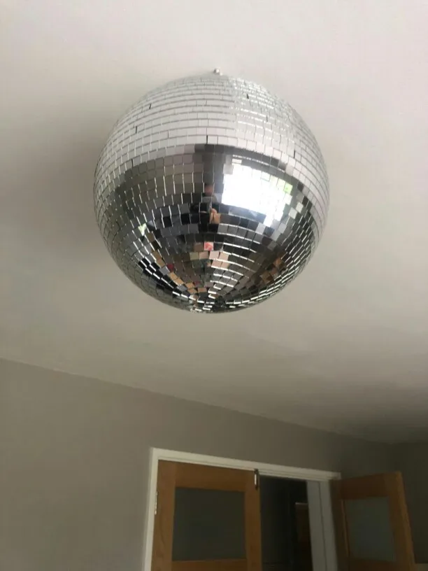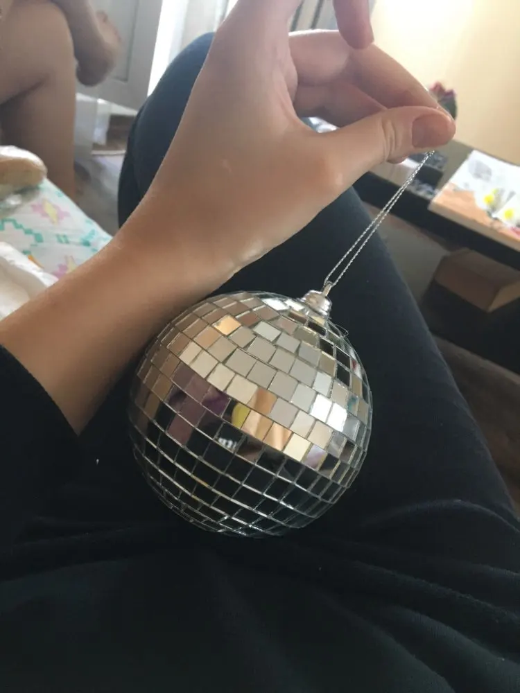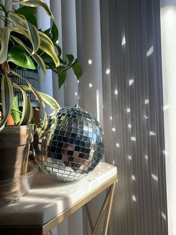 Сначала я получил этот диско-шар для фотосессии, но с тех пор я решили сохранить его в своем доме в качестве декора. Мне нравится, как свет отскакивает от него по утрам! Пока я сижу на полке, у нее также есть крючок сверху, чтобы вы могли его повесить.