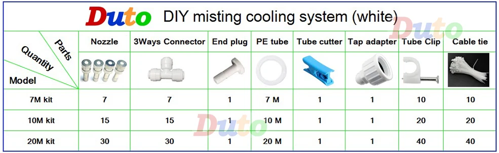 Область применения: удаление и увлажнение пыли растений, сельскохозяйственное орошение садоводстваИнструкции:1. Сначала очистите грязь в зазоре плитки. Глубина зазора больше подходит для 2-3 мм. Рекомендуется, чтобы зазор был слишком большим, а затем используйте реформу плитки.2. Плитка реформировать вверх дном и встряхнуть около 20 секунд, оторвать герметичную алюминиевую фольгу, открутить колпачок, направить насадку вертикально на зазор плитки, И равномерно выдавить пасту вдоль промежутка. Затем выдавите пасту и оторвите ее после соскабливания пасты).3. Используйте небольшой скребок (или шарик для квилтинга), чтобы слегка отодвинуть назад и вперед несколько раз, чтобы реформа плитки равномерно вошла в зазор. Рекомендуется наносить больше раз, чтобы заполнить пробел и максимально заполнить.4. После соскабливания удалите излишки пасты и дайте ей высохнуть естественным путем. Рекомендуется сушить в течение 2-3 дней. Его не следует трогать в период.5, для больших или глубоких промежутков можно наносить несколько раз через день.Этапы установки:1. Рекомендуется устанавливать систему распыления на высоте от 2,5 м до 3 м.2. Подключите адаптер к крану.3. Включите кран и очистите систему в течение 1 минуты для очистки системы и удаления загрязнений.4. Вставьте распылительную насадку в Тройник, за исключением одной насадки на конце.5. Включите кран для очистки системы на 2 минуты, чтобы убедиться, что система полностью очищена.6. Закройте воду и установите последнюю насадку на стык, используя торцевую заглушку.7. Для фиксации распылительной трубы предусмотрен седельный зажим.8. Включите кран, пока распылитель не заработает и наслаждайтесь системой охлаждения.9. Когда система распыления не используется в течение длительного времени, закройте насадку и сохраните ее сухой и чистой.