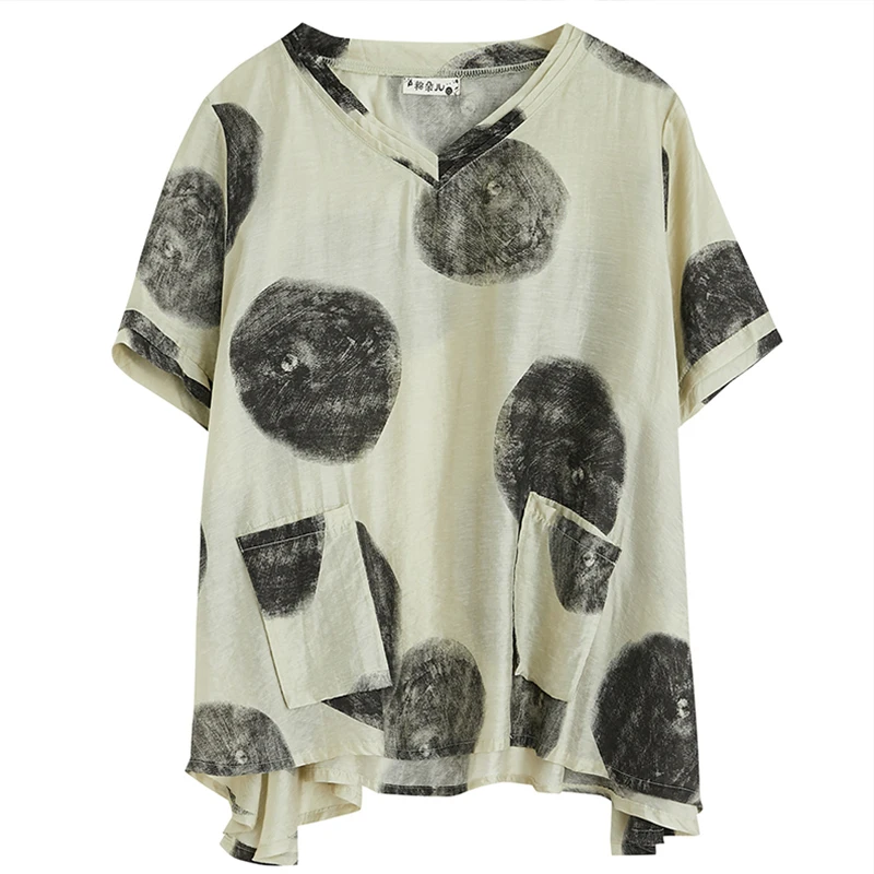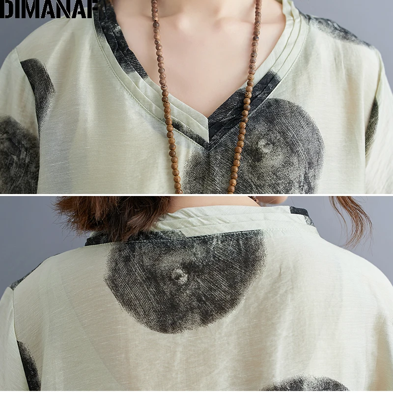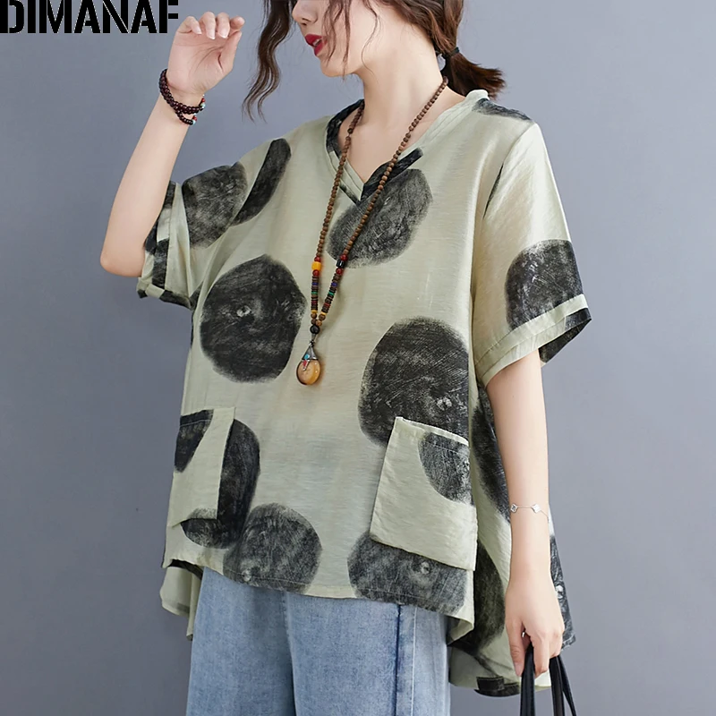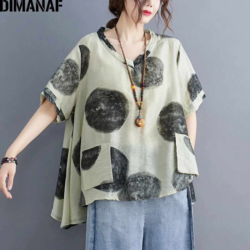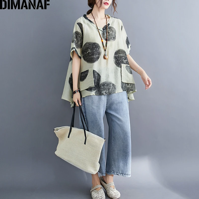 Летние платья DIMANAF Женская одежда, винтажный Топ, свободная рубашка из хлопка и льна с принтом в горошек