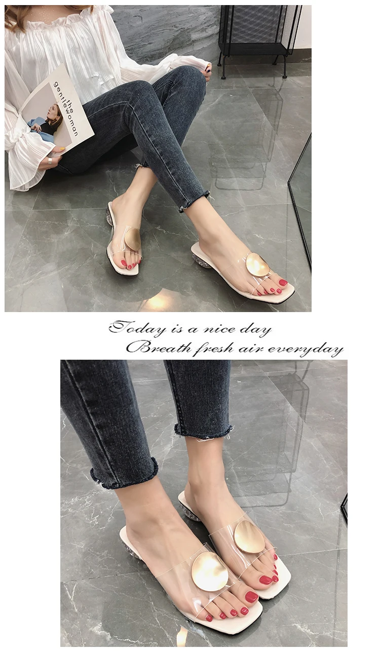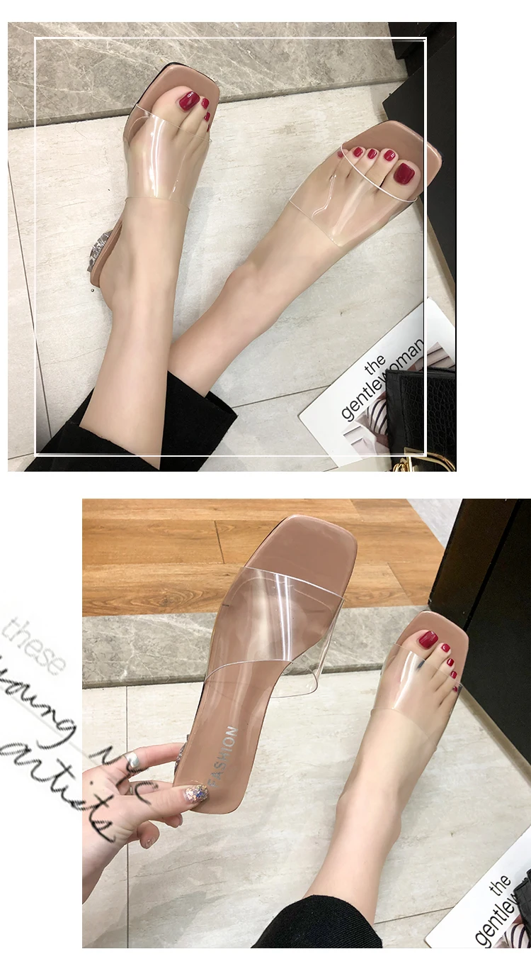 Женские туфли на высоком каблуке, летние туфли без задника, с металлической пряжкой, прозрачные, на квадратном низком каблуке, с ремешком, Элегантные Тапочки