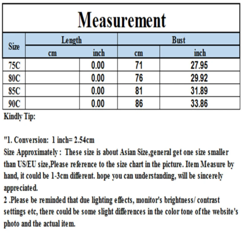 1. Пожалуйста, внимательно проверьте таблицу размеров, чтобы выбрать правильный размер;2. Ручное измерение, погрешность около 1-2 см, 1 дюйм = 2,54 см. Китайский размер Под грудью 75C 71-75 см 80C 76-80 см 85C 81-85 см 90C 86 см